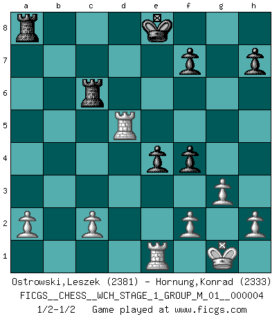 Last move : 1/2-1/2 2008 May 23 1:1:42 [Event "FICGS__CHESS__WCH_STAGE_1_GROUP_M_01__000004"] [Site "FICGS"] [Date "2008.01.08"] [Round "1"] [White "Ostrowski,Leszek"] [Black "Hornung,Konrad"] [Result "1/2-1/2"] [WhiteElo "2381"] [BlackElo "2333"] 1.e4 c5 2.Nf3 Nc6 3.d4 cxd4 4.Nxd4 Nf6 5.Nc3 e5 6.Ndb5 d6 7.Bg5 a6 8.Na3 b5 9.Bxf6 gxf6 10.Nd5 f5 11.Bd3 Be6 12.O-O Bxd5 13.exd5 Ne7 14.Nxb5 Bg7 15.Nc3 e4 16.Bc4 Ng6 17.Qh5 Bxc3 18.bxc3 Qf6 19.Qh6 Rg8 20.Rab1 Qxc3 21.Bxa6 Qg7 22.Qxg7 Rxg7 23.Rb6 Nf4 24.g3 Nxd5 25.Rxd6 Nc3 26.Bc4 Rg6 27.Rd2 f4 28.Re1 Rc6 29.Bd5 Nxd5 30.Rxd5 1/2-1/2 Sicilian : Pelikan (Lasker/Sveshnikov) variation Kingside Castling by player White (move 12) This chess game ended in a draw. Follow this game move after move (download)You can only get good at Chess if you love the game. (Bobby Fischer) Schach ist eine Sache der genauen Beurteilung, wann man zuschlagen und wann man sich ducken muss. (Robert James Fischer) Fischer no está bajo la obligación de nadie. (Joseph Platz) Les échecs sont un jeu terrible. Si vous n'avez pas le centre, votre adversaire a une position plus libre. Par contre, si vous avez le centre, alors vous avez vraiment quelque chose pour laquelle vous inquiéter ! (Siegbert Tarrasch) He who fights with monsters should be careful lest he thereby become a monster. (Friedrich Nietzsche, Beyond Good and Evil)