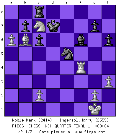 Last move : 1/2-1/2 2008 April 24 2:36:4 [Event "FICGS__CHESS__WCH_QUARTER_FINAL_1__000004"] [Site "FICGS"] [Date "2008.01.08"] [Round "4"] [White "Noble,Mark"] [Black "Ingersol,Harry"] [Result "1/2-1/2"] [WhiteElo "2414"] [BlackElo "2555"] 1.e4 e5 2.Nf3 Nc6 3.Bb5 Nf6 4.O-O Nxe4 5.d4 Nd6 6.Bxc6 dxc6 7.dxe5 Nf5 8.Qxd8+ Kxd8 9.Rd1+ Ke8 10.Nc3 Ne7 11.Nd4 Ng6 12.f4 f6 13.Be3 Bg4 14.Rd2 fxe5 15.fxe5 Rd8 16.Re1 Be7 17.h3 Bc8 18.Ne4 Rd5 19.Ng5 h6 20.Nge6 Bxe6 21.Nxe6 Rxe5 22.Nxc7+ Kf7 23.Rf1+ Bf6 24.Rd7+ Re7 25.Rxe7+ Kxe7 26.Bxa7 Kd7 27.Bb6 Bxb2 28.a4 Bf6 29.a5 Ne5 30.Rf4 Rc8 31.a6 1/2-1/2 Ruy Lopez : Berlin defense, Open variation Kingside Castling by player White (move 4) This chess game ended in a draw. Follow this game move after move (download)I guess a certain amount of temperament is expected of Chess geniuses. (Ron Gross) Im Reiche der Wirklichkeit ist man nie so glücklich wie im Reiche der Gedanken. (Arthur Schopenhauer) Por tratar de evitar la pérdida de una pieza, muchas personas han perdido una partida de Ajedrez. (Savielly Tartakover) La vérité est comme le meilleur coup aux échecs : elle existe, mais il faut la chercher. (Arturo Perez-Reverte) Either move or be moved. (Ezra Pound)