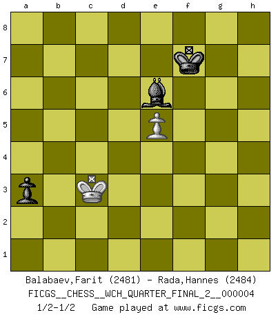 Last move : 1/2-1/2 2008 May 23 0:30:42 [Event "FICGS__CHESS__WCH_QUARTER_FINAL_2__000004"] [Site "FICGS"] [Date "2008.01.08"] [Round "8"] [White "Balabaev,Farit"] [Black "Rada,Hannes"] [Result "1/2-1/2"] [WhiteElo "2481"] [BlackElo "2484"] 1.e4 e5 2.Nf3 Nf6 3.Nxe5 d6 4.Nf3 Nxe4 5.d4 d5 6.Bd3 Be7 7.O-O Nc6 8.c4 Nf6 9.Nc3 O-O 10.cxd5 Nxd5 11.Re1 Be6 12.h3 Bf6 13.Ne4 Bf5 14.Qb3 Na5 15.Qb5 c6 16.Qa4 b5 17.Qc2 Nb4 18.Qc3 Nxd3 19.Qxd3 Re8 20.Nxf6+ Qxf6 21.Qc3 Rxe1+ 22.Qxe1 Nc4 23.a4 h6 24.b3 Nb6 25.axb5 cxb5 26.Qe5 Qxe5 27.dxe5 a5 28.Nd4 Bd3 29.f4 a4 30.Kf2 Rc8 31.Ke3 Bf1 32.Kf2 Bd3 33.bxa4 bxa4 34.Ba3 Be4 35.Bd6 Rc4 36.Rd1 Nd5 37.Rd2 Nb4 38.Ke3 Bd5 39.Bxb4 Rxb4 40.Nf5 Rb3+ 41.Kf2 Be4 42.Nd4 Rd3 43.Rxd3 Bxd3 44.Ke3 Bf1 45.Kf2 Ba6 46.Nc2 Kh7 47.g4 h5 48.Kg3 Kh6 49.Na3 g5 50.fxg5+ Kxg5 51.gxh5 Kxh5 52.Kf4 Bf1 53.Ke3 Bxh3 54.Kd4 Kg5 55.Nc4 Be6 56.Nd6 Kg6 57.Kc3 a3 58.Nxf7 Kxf7 1/2-1/2 Petrov : Classical attack Kingside Castling by player White (move 7) Kingside Castling by player Black (move 9) 10 pieces endgame at move 50 : White KNPPP , Black KBPPP WHITE : King + 1 Knight 3 Pawns BLACK : King + 1 Bishop 3 Pawns 9 pieces endgame at move 51 : White KNPPP , Black KBPP WHITE : King + 1 Knight 3 Pawns BLACK : King + 1 Bishop 2 Pawns 8 pieces endgame at move 51 : White KNPP , Black KBPP WHITE : King + 1 Knight 2 Pawns BLACK : King + 1 Bishop 2 Pawns 7 pieces endgame at move 53 : White KNP , Black KBPP WHITE : King + 1 Knight 1 Pawn BLACK : King + 1 Bishop 2 Pawns 6 pieces endgame at move 58 : White KNP , Black KBP WHITE : King + 1 Knight 1 Pawn BLACK : King + 1 Bishop 1 Pawn 5 pieces endgame at move 58 : White KP , Black KBP WHITE : King + 1 Pawn BLACK : King + 1 Bishop 1 Pawn This chess game ended in a draw. Follow this game move after move (download)Chess is mental torture. (Garry Kasparov) Pläne sind die Träume des Verständigen. (Ernst Freiherr von Feuchtersleben) Aquel que toma al Peón de Caballo de la Reina, se pasará la noche a dormir en la calle. (Anónimo) Aux échecs, les retours au sommet sont rares : les dommages psychologiques consécutifs à une défaite sont trop sévères. (Daily Telegraph) To err is human, to shift the blame on someone else is tactical. (Mladen Jankovic)