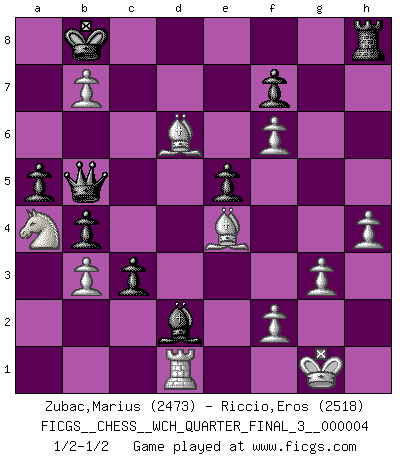Last move : 1/2-1/2 2008 March 26 8:0:8 [Event "FICGS__CHESS__WCH_QUARTER_FINAL_3__000004"] [Site "FICGS"] [Date "2008.01.08"] [Round "8"] [White "Zubac,Marius"] [Black "Riccio,Eros"] [Result "1/2-1/2"] [WhiteElo "2473"] [BlackElo "2518"] 1.d4 d5 2.c4 c6 3.Nf3 Nf6 4.Nc3 e6 5.Bg5 dxc4 6.e4 b5 7.e5 h6 8.Bh4 g5 9.Nxg5 hxg5 10.Bxg5 Nbd7 11.g3 Bb7 12.Bg2 Qb6 13.exf6 O-O-O 14.O-O c5 15.d5 b4 16.Na4 Qb5 17.a3 Nb8 18.axb4 cxb4 19.Qd4 Nc6 20.dxc6 Rxd4 21.cxb7 Kb8 22.Be3 e5 23.b3 c3 24.Rad1 Rd6 25.Rfe1 a5 26.h4 Rd3 27.Be4 Rxd1 28.Rxd1 Bh6 29.Bc5 Bd2 30.Bd6 1/2-1/2 QGD Slav : 4.Nc3 Queenside Castling by player Black (move 13) Kingside Castling by player White (move 14) This chess game ended in a draw. Follow this game move after move (download)Chess is a more highly symbolic game, but the aggressions are therefore even more frankly represented in the play. It probably began as a war game; that is, the representation of a miniature battle between the forces of two kingdoms. (Karl Meninger) Kostenjuk hat keinen Sexappeal. (Loek van Wely) El ganar no lo es todo... pero el perder es nada. (Mednis) Les échecs sont plus proches de l'art de l'assassinat que de l'art de la guerre. (Arturo Perez-Reverte) Pretend inferiority and encourage his arrogance. (Sun Tzu)