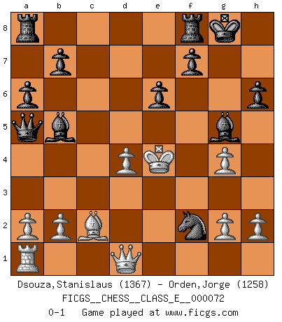 Last move : 0-1 2008 January 22 19:8:8 [Event "FICGS__CHESS__CLASS_E__000072"] [Site "FICGS"] [Date "2008.01.08"] [Round "1"] [White "Dsouza,Stanislaus"] [Black "Orden,Jorge"] [Result "0-1"] [WhiteElo "1367"] [BlackElo "1258"] 1.d4 d5 2.Nf3 Nf6 3.Bg5 e6 4.e3 Be7 5.Nbd2 h6 6.Bh4 O-O 7.Bd3 a6 8.Ne5 Nbd7 9.c3 g5 10.Bg3 c5 11.Nxd7 Bxd7 12.e4 dxe4 13.Nxe4 cxd4 14.cxd4 Bc6 15.Bc2 Nxe4 16.f3 Qa5+ 17.Ke2 Nxg3+ 18.Kf2 Nxh1+ 19.Ke3 g4 20.fxg4 Bg5+ 21.Kd3 Bb5+ 22.Ke4 Nf2+ 0-1 Torre attack (Tartakower variation) Kingside Castling by player Black (move 6) Player Black won this chess game. Follow this game move after move (download)The beauty of a move lies not in its' appearance but in the thought behind it. (Siegbert Tarrasch) Um dein Spiel zu verbessern musst du zuallererst das Endspiel studieren, denn diese kann unabhängig studiert werden. Die Eröffnung und das Mittelspiel müssen immer in Bezug gesetzt werden zum Endspiel. (José Raúl Capablanca) El Ajedrez lo es todo: arte, ciencia y deporte. (Anatoly Karpov) La tactique est l'élément le plus important du milieu de jeu. (Siegbert Tarrasch) A person who never made a mistake never tried anything new. (Albert Einstein)