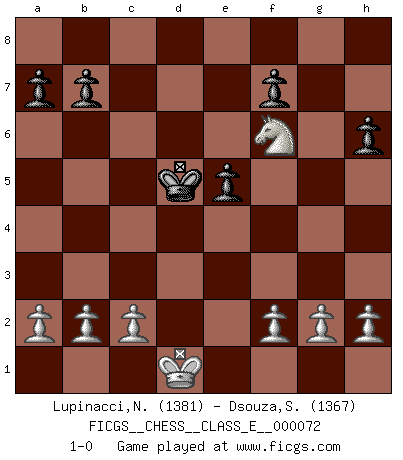 Last move : 1-0 2008 January 22 16:43:29 [Event "FICGS__CHESS__CLASS_E__000072"] [Site "FICGS"] [Date "2008.01.08"] [Round "1"] [White "Lupinacci,Nicola"] [Black "Dsouza,Stanislaus"] [Result "1-0"] [WhiteElo "1381"] [BlackElo "1367"] 1.e4 c5 2.Nf3 Nc6 3.d4 cxd4 4.Nxd4 d5 5.Bb5 dxe4 6.Nxc6 Qxd1+ 7.Kxd1 Bd7 8.Nd4 O-O-O 9.Ke2 e5 10.Bxd7+ Rxd7 11.Nb3 Nf6 12.Bg5 Be7 13.Nc3 Rhd8 14.Rad1 Rxd1 15.Rxd1 Rxd1 16.Kxd1 h6 17.Bxf6 Bxf6 18.Nxe4 Kd7 19.Nxf6+ gxf6 20.Nc5+ Kc6 21.Ne4 Kd5 22.Nxf6+ 1-0 Sicilian : Nimzovich variation Queenside Castling by player Black (move 8) Player White won this chess game. Follow this game move after move (download)It is not enough to be a good player... you must also play well. (Siegbert Tarrasch) Es macht mich traurig, wenn ich sehe, dass Golfprofis mehr verdienen als Schachsportler. Obwohl ich davon überzeugt bin, dass wir Schachspieler viel härter trainieren müssen als die Golfer. (Alexandra Kosteniuk) El sobresalir en el Ajedrez es un signo de una mente intrigante. (Sir Arthur Conan Doyle) Ce qui est bien, c'est d'avoir tout un tas de pièces en prise : l'adversaire ne peut en prendre qu'une à la fois. Cité par Thierry Audin. Computers are like Old Testament gods; lots of rules and no mercy. (Joseph Campbell)