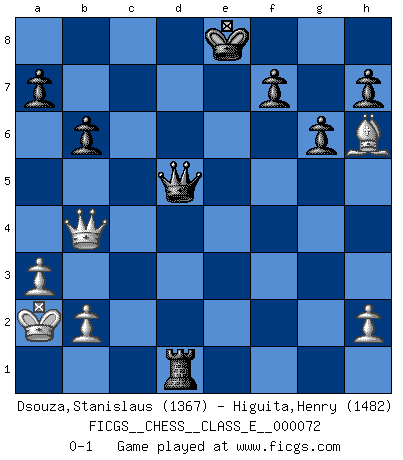 Last move : 0-1 2008 July 19 3:35:19 [Event "FICGS__CHESS__CLASS_E__000072"] [Site "FICGS"] [Date "2008.01.08"] [Round "1"] [White "Dsouza,Stanislaus"] [Black "Higuita,Henry"] [Result "0-1"] [WhiteElo "1367"] [BlackElo "1482"] 1.d4 g6 2.e4 Bg7 3.Be2 b6 4.Be3 Bb7 5.c3 Bxe4 6.f3 Bb7 7.Nd2 Nf6 8.f4 Bxg2 9.Bf3 Bxh1 10.Bxh1 c6 11.Ne4 Nxe4 12.Bxe4 d5 13.Bc2 e6 14.Nf3 Nd7 15.Qe2 Nf6 16.Ne5 Qc7 17.O-O-O Ne4 18.Bxe4 dxe4 19.c4 Bxe5 20.fxe5 O-O-O 21.Kb1 Rhf8 22.Bh6 Rg8 23.Qxe4 Rd7 24.d5 exd5 25.cxd5 Rxd5 26.Rxd5 cxd5 27.Qxd5 Rd8 28.Qa8+ Kd7 29.Qd5+ Ke8 30.Qb5+ Rd7 31.a3 Qc5 32.Qa4 Qxe5 33.Qb4 Rd1+ 34.Ka2 Qd5+ 0-1 Modern defense Queenside Castling by player White (move 17) Queenside Castling by player Black (move 20) Player Black won this chess game. Follow this game move after move (download)Every Pawn is a potential Queen. (James Mason) Schach sollte überall auf der Welt Schulfach werden. Es fördert die geistige Auseinandersetzung. Es lehrt die Demut in der Niederlage. (Garry Kasparov) Es el objetivo de la escuela moderna no tratar cada posición de acuerdo a una regla general, sino de acuerdo al principio inherente en la posición. (Richard Reti) Les Echecs sont et restent toujours un combat, un combat intégral comme la boxe, la lutte ou un autre sport, et où il doit y avoir un vainqueur et un vaincu. (Joseph Emil Diemer) A clear conscience is usually the sign of a bad memory. (Unknown)