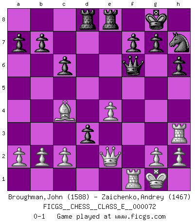 Last move : 0-1 2008 May 18 22:13:15 [Event "FICGS__CHESS__CLASS_E__000072"] [Site "FICGS"] [Date "2008.01.08"] [Round "1"] [White "Broughman,John"] [Black "Zaichenko,Andrey"] [Result "0-1"] [WhiteElo "1588"] [BlackElo "1467"] 1.e4 e5 2.Nf3 d6 3.Bc4 Nc6 4.Nc3 Nf6 5.O-O Be7 6.d4 exd4 7.Nxd4 Bd7 8.Bg5 O-O 9.Re1 h6 10.Bh4 Nh7 11.Bxe7 Qxe7 12.Nd5 Qd8 13.Re3 Ne5 14.Be2 c6 15.Nf4 Qg5 16.Nh3 Qf6 17.f4 Bxh3 18.fxe5 dxe5 19.Rxh3 exd4 20.Bc4 Rad8 21.Qe2 Rfe8 22.Rf1 d3 0-1 Philidor's defense Kingside Castling by player White (move 5) Kingside Castling by player Black (move 8) Player Black won this chess game. Follow this game move after move (download)In life, as in Chess, one's own Pawns block one's way. A man's very wealth, ease, leisure, children, books, which should help him to win, more often checkmate him. (Charles Buxton) Jeder weiß, dass Gasprom Putins persönliches Machtinstrument ist. Die Firma wird vom Kreml aus geleitet und wird schon deshalb nie transparent sein. (Garry Kasparov) El Ajedrez es un juego de pelea el cual es puramente intelectual e incluye la suerte. (Richard Reti) On croit qu'il y a plus de mauvais joueurs que de bons joueurs, c'est faux : Il y a autant de joueurs qui gagnent que de joueurs qui perdent. (Philippe Geluck) The good fighters of old first put themselves beyond the possibility of defeat, and then waited for an opportunity of defeating the enemy. (Sun Tzu)