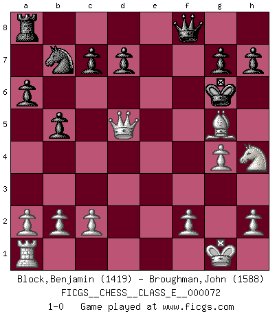 Last move : 1-0 2008 February 25 22:20:0 [Event "FICGS__CHESS__CLASS_E__000072"] [Site "FICGS"] [Date "2008.01.08"] [Round "1"] [White "Block,Benjamin"] [Black "Broughman,John"] [Result "1-0"] [WhiteElo "1419"] [BlackElo "1588"] 1.e4 e5 2.Nf3 Nc6 3.Bb5 a6 4.Ba4 b5 5.Bb3 Nf6 6.O-O Nxe4 7.d4 exd4 8.Re1 f5 9.Bd5 Bb7 10.Nbd2 Na5 11.Nxe4 fxe4 12.Rxe4+ Be7 13.Bxb7 Nxb7 14.Bg5 O-O 15.Rxe7 Qc8 16.Qxd4 Rf7 17.Rxf7 Kxf7 18.Qd5+ Kg6 19.g4 Qf8 20.Nh4+ 1-0 Ruy Lopez : Caro variation Kingside Castling by player White (move 6) Kingside Castling by player Black (move 14) Player White won this chess game. Follow this game move after move (download)Bobby just drops the pieces and they fall on the right squares. (Miguel Najdorf) Ivan Sokolov treibt mich als Beifahrer an mit go Loeky go - . (Loek van Wely) Uno por uno, yo los acribillé, mi superioridad muy pronto se volvio aparente. (Jose Capablanca) Plusieurs personnes se sont demandées comment Tal faisait pour gagner... En fait, c'est très simple ! Il met ses pièces au centre de l'échiquier et les sacrifie quelque part ! (David Bronstein) Vladimir Ras-Putin is still alive... He is also a good actor, I saw him in the Lord of the Rings. (Rodolfo d'Ettorre)