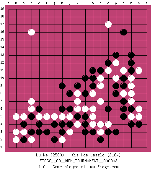 Last move : 1-0 2008 May 15 11:48:27 [Event "FICGS__GO__WCH_TOURNAMENT__000002"] [Site "FICGS"] [Date "2008.01.09"] [Round "1"] [Black "Lu,Ke"] [White "Kis-Kos,Laszlo"] [Result "1-0"] [Rating 1 "2500"] [Rating 2 "2164"] 1.q16 d4 2.r4 d16 3.f3 d6 4.l3 r10 5.r13 r7 6.q9 r9 7.q6 s5 8.q7 j3 9.d3 c3 10.c2 d2 11.e3 b2 12.c4 b3 13.d5 c5 14.e4 b5 15.e6 d7 16.k5 f5 17.h4 e5 18.s4 r5 19.q5 m4 20.m3 n4 21.o3 o4 22.p3 n7 23.r6 q8 24.p8 r8 25.p9 s6 26.l8 n9 27.m10 n10 28.n11 o11 29.m11 p10 30.o6 m6 31.q10 q11 32.r11 s11 33.r12 o17 34.o12 p12 35.p13 k6 36.h6 j5 37.l5 l6 38.j4 h5 39.j6 g5 40.j8 k7 41.h9 k8 42.k9 l9 43.m9 m8 44.l10 m5 45.h3 n3 46.n2 k4 47.l4 h2 48.g2 g3 49.g4 1-0 Here are the names of the openings (joseki) played in the four corners : Corner d4 : d4 f3 Hoshi (Hwajeom, Seongjeom, Xingwei`) 4-4 Point. The star or hoshi (4-4) point, emphasizing influence at the potential expense of territory. Ikken Kakari (Hankan Keolch'im, Yi Gua`jiao~, 1-Space Low Approach). Black 2 is the standard approach move to the 4-4. Player Black won this Go (weiqi, baduk) game. Follow this game move after move (download)It is difficult to know exactly what you are doing. (Pierre Audouard) Whenever people agree with me, I always feel I must be wrong. (Oscar Wilde)