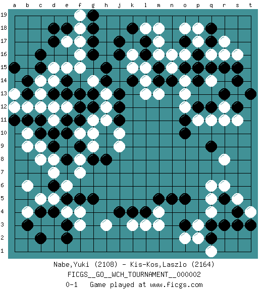 Last move : 0-1 2008 July 22 11:13:5 [Event "FICGS__GO__WCH_TOURNAMENT__000002"] [Site "FICGS"] [Date "2008.01.09"] [Round "1"] [Black "Nabe,Yuki"] [White "Kis-Kos,Laszlo"] [Result "0-1"] [Rating 1 "2108"] [Rating 2 "2164"] 1.d17 q4 2.d4 q16 3.o3 m3 4.o5 q6 5.l4 l3 6.k4 m4 7.m5 k3 8.j4 h3 9.n5 p3 10.o17 m17 11.o15 q14 12.l16 m16 13.l17 l18 14.m15 l15 15.k18 m18 16.j17 n15 17.m14 o16 18.p16 n16 19.p15 p17 20.q17 p18 21.q18 o18 22.q15 r16 23.r15 r17 24.s15 s16 25.n14 k15 26.j16 o14 27.r13 r11 28.q9 p11 29.o10 o13 30.q12 q11 31.p12 l13 32.o11 o12 33.p14 m13 34.s12 s11 35.s14 r8 36.r5 q5 37.s3 r6 38.q2 p2 39.r3 s5 40.s4 t4 41.q3 o2 42.t3 q1 43.g5 f3 44.d6 d15 45.d13 f15 46.f13 f17 47.c15 c14 48.c16 d14 49.c10 c12 50.e10 c8 51.d9 c5 52.c4 b4 53.b3 b6 54.c2 d5 55.e5 e4 56.e3 f4 57.e2 e6 58.f5 d7 59.e18 r12 60.t13 f18 61.g16 e17 62.d18 k16 63.h14 g14 64.g13 h13 65.h15 f16 66.j13 h12 67.j12 g11 68.k14 l14 69.j11 e12 70.f11 g10 71.e13 f8 72.g12 h11 73.f9 g9 74.g8 j10 75.g18 f19 76.b13 c13 77.b14 b12 78.b11 a13 79.a15 b9 80.a11 d12 81.f12 a12 82.e14 e15 83.e8 f7 84.h8 j9 85.g17 d11 86.d10 f10 87.e11 b10 88.c11 d8 89.g19 c9 0-1 Here are the names of the openings (joseki) played in the four corners : Corner q4 : q4 o3 Hoshi (Hwajeom, Seongjeom, Xingwei`) 4-4 Point. The star or hoshi (4-4) point, emphasizing influence at the potential expense of territory. Ikken Kakari (Hankan Keolch'im, Yi Gua`jiao~, 1-Space Low Approach). Black 2 is the standard approach move to the 4-4. Corner q16 : q16 o17 Hoshi (Hwajeom, Seongjeom, Xingwei`) 4-4 Point. The star or hoshi (4-4) point, emphasizing influence at the potential expense of territory. Ikken Kakari (Hankan Keolch'im, Yi Gua`jiao~, 1-Space Low Approach). Black 2 is the standard approach move to the 4-4. Player White won this Go (weiqi, baduk) game. Follow this game move after move (download)More haste less speed. (John Fairbairn) I think your argument is specious - I think your tie is ugly. (Gregory House to Dr. Foreman, House M.D.)