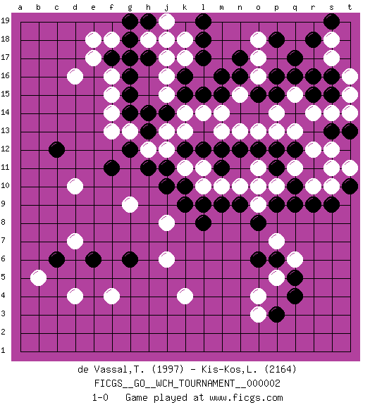 Last move : 1-0 2008 June 19 13:59:34 [Event "FICGS__GO__WCH_TOURNAMENT__000002"] [Site "FICGS"] [Date "2008.01.09"] [Round "1"] [Black "de Vassal,Thibault"] [White "Kis-Kos,Laszlo"] [Result "1-0"] [Rating 1 "1997"] [Rating 2 "2164"] 1.q4 d16 2.q17 d4 3.r15 k17 4.q9 k4 5.n17 d10 6.c6 b5 7.e6 f4 8.g6 o3 9.f17 e17 10.h17 f16 11.g16 f18 12.g17 f15 13.k16 l16 14.l17 j16 15.k15 j17 16.g15 j15 17.g14 k14 18.l15 l14 19.m15 j13 20.g12 g9 21.h11 k11 22.j10 j8 23.k9 j6 24.l12 m14 25.l18 n15 26.m16 d7 27.l8 q6 28.p3 o4 29.o8 m10 30.n9 o13 31.k12 j12 32.j11 l11 33.m12 n10 34.m11 l10 35.o12 p10 36.p12 p13 37.q12 q13 38.q10 r14 39.s15 r12 40.r11 s12 41.p15 o16 42.p6 p5 43.q5 q15 44.q16 p14 45.p16 n13 46.n12 s14 47.o15 h18 48.g18 k18 49.h19 j19 50.g19 s10 51.s9 s11 52.t10 r10 53.r9 q11 54.o10 o11 55.p11 o9 56.p9 o10 57.m9 g13 58.h13 f13 59.h14 h12 60.j14 k13 61.l9 e18 62.f11 f14 63.j18 m13 64.k10 h18 65.l19 j18 66.c12 s17 67.r16 t11 68.t13 t14 69.s13 t15 70.s16 t16 71.r18 s18 72.s19 o17 73.p18 o18 74.n16 p7 75.o6 1-0 Here are the names of the openings (joseki) played in the four corners : Corner d4 : d4 c6 Hoshi (Hwajeom, Seongjeom, Xingwei`) 4-4 Point. The star or hoshi (4-4) point, emphasizing influence at the potential expense of territory. Ikken Kakari (Hankan Keolch'im, Yi Gua`jiao~, 1-Space Low Approach). Black 2 is the standard approach move to the 4-4. Corner d16 : d16 f17 Hoshi (Hwajeom, Seongjeom, Xingwei`) 4-4 Point. The star or hoshi (4-4) point, emphasizing influence at the potential expense of territory. Ikken Kakari (Hankan Keolch'im, Yi Gua`jiao~, 1-Space Low Approach). Black 2 is the standard approach move to the 4-4. Player Black won this Go (weiqi, baduk) game. Follow this game move after move (download)Six eyes in a rectangle are alive. (Anonymous) If you work for a living, why do you kill yourself working ? (Tuco to a chicken in The Good, The Bad and The Ugly)