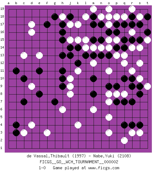 Last move : 1-0 2008 May 19 9:52:7 [Event "FICGS__GO__WCH_TOURNAMENT__000002"] [Site "FICGS"] [Date "2008.01.09"] [Round "1"] [Black "de Vassal,Thibault"] [White "Nabe,Yuki"] [Result "1-0"] [Rating 1 "1997"] [Rating 2 "2108"] 1.q4 d16 2.q17 d4 3.r15 o3 4.q10 k4 5.q7 k17 6.c10 c13 7.c7 f3 8.m17 k15 9.m15 q12 10.f17 d17 11.h17 r11 12.r10 r14 13.q14 s14 14.s15 q13 15.p14 s12 16.h15 k13 17.h13 l18 18.m18 e13 19.m13 k11 20.h11 j10 21.h10 j9 22.b4 c3 23.b3 q2 24.e11 d9 25.e8 r3 26.r4 s3 27.s4 s10 28.s9 t9 29.s8 o5 30.h9 j8 31.g7 h6 32.m8 o8 33.m10 m6 34.o9 p8 35.p9 q8 36.p7 o7 37.r7 m12 38.k14 l14 39.j14 l15 40.l13 m14 41.n13 o14 42.o13 n14 43.n15 o11 44.r9 j15 45.j13 h18 46.g18 j17 47.h16 p15 48.q15 o17 49.o18 p18 50.o16 n18 51.n17 o19 52.p17 q18 53.r17 m19 54.j18 s18 55.r18 r19 56.s17 p13 57.k12 o15 58.p16 o18 59.b11 t15 60.t16 r16 61.t18 1-0 Comment by player 1 : Thibault de Vassal : Hello Yuki, thanks for the game. Good luck in your other games in this tournament ! Best wishes, Thibault Comment by player 2 : Yuki Nabe : good game Here are the names of the openings (joseki) played in the four corners : Corner q4 : q4 o3 Hoshi (Hwajeom, Seongjeom, Xingwei`) 4-4 Point. The star or hoshi (4-4) point, emphasizing influence at the potential expense of territory. Ikken Kakari (Hankan Keolch'im, Yi Gua`jiao~, 1-Space Low Approach). White 2 is the standard approach move to the 4-4. Corner d4 : d4 c7 Hoshi (Hwajeom, Seongjeom, Xingwei`) 4-4 Point. The star or hoshi (4-4) point, emphasizing influence at the potential expense of territory. Nikken Kakari (Dukan Keolch'im, E`r Gua`jiao~, 2-Space Low Approach). White typically answers by 7-3 or 3-5 (which is not joseki). Player Black won this Go (weiqi, baduk) game. Follow this game move after move (download)For rectangular six in the corner, dame is necessary. (Anonymous) I take risks, sometimes patients die, but not taking risks causes more patients to die. So I guess my biggest problem is I've been cursed with the ability to do the math. (Gregory House, House M.D.)