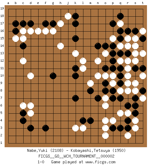 Last move : 1-0 2008 May 9 10:15:42 [Event "FICGS__GO__WCH_TOURNAMENT__000002 "] [Site "FICGS"] [Date "2008.01.09"] [Round "1"] [Black "Nabe,Yuki "] [White "Kobayashi,Tetsuya "] [Result "1-0"] [Rating 1 "2108"] [Rating 2 "1950"] 1.d3 d16 2.r4 q17 3.q15 q12 4.p17 d5 5.c5 c6 6.c4 d6 7.f3 d10 8.q18 p4 9.p3 o3 10.q3 o4 11.r6 k3 12.f17 h17 13.k17 f16 14.c14 c12 15.c17 c16 16.d17 e16 17.b16 b15 18.b17 c15 19.g17 g16 20.k15 h14 21.k10 r15 22.r16 r14 23.s16 p15 24.q16 r9 25.l4 l3 26.m4 o2 27.q10 r10 28.q11 r11 29.q13 r12 30.p12 k13 31.k7 n12 32.g10 q5 33.n14 r5 34.s5 s3 35.r3 s4 36.s6 r2 37.q7 p9 38.o11 o7 39.q9 q8 40.p8 r8 41.p7 o10 42.o9 p10 43.p11 n10 44.o8 o13 45.p13 q14 46.p14 m9 47.n7 o6 48.m8 l11 49.k11 l12 50.o14 j18 51.k18 s15 52.r13 s13 53.t15 s14 54.t9 s9 55.t8 t10 56.s11 s12 57.t14 t7 58.s7 s8 59.t8 t13 60.t11 t16 61.t15 1-0 Here are the names of the openings (joseki) played in the four corners : Corner q16 : q17 q15Komoku (Somok, Xiao~mu`) 3-4 Point. The komoku (3-4) point is the traditional corner enclosure move..Ikken Takagakari (Hankan Nop'dakeolch'im, Yi Gaogua`jiao~, 1-Space High Approach). The 5-4 approach move has become more popular in modern times, as modern Go emphasizes speed and influence. Corner d4 : d3 d5Komoku (Somok, Xiao~mu`) 3-4 Point. The komoku (3-4) point is the traditional corner enclosure move..Ikken Takagakari (Hankan Nop'dakeolch'im, Yi Gaogua`jiao~, 1-Space High Approach). The 5-4 approach move has become more popular in modern times, as modern Go emphasizes speed and influence. Corner q4 : r4 p4Komoku (Somok, Xiao~mu`) 3-4 Point. The komoku (3-4) point is the traditional corner enclosure move..Ikken Takagakari (Hankan Nop'dakeolch'im, Yi Gaogua`jiao~, 1-Space High Approach). The 5-4 approach move has become more popular in modern times, as modern Go emphasizes speed and influence. Corner d16 : d16 f17Hoshi (Hwajeom, Seongjeom, Xingwei`) 4-4 Point. The star or hoshi (4-4) point, emphasizing influence at the potential expense of territory.Ikken Kakari (Hankan Keolch'im, Yi Gua`jiao~, 1-Space Low Approach). Black 2 is the standard approach move to the 4-4. Player Black won this Go (weiqi, baduk) game.Follow this game move after move (download ) Avoid the plate connection. (Anonymous) There is no vagueness without wind. (Chinese proverb)