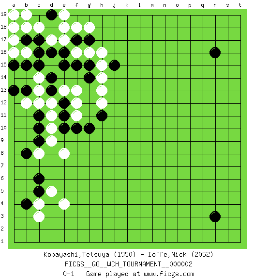 Last move : 0-1 2008 April 1 9:20:54 [Event "FICGS__GO__WCH_TOURNAMENT__000002"] [Site "FICGS"] [Date "2008.01.09"] [Round "1"] [Black "Kobayashi,Tetsuya"] [White "Ioffe,Nick"] [Result "0-1"] [Rating 1 "1950"] [Rating 2 "2052"] 1.r16 d17 2.r3 e4 3.c15 d12 4.d14 b16 5.f17 f16 6.e16 e17 7.e15 g16 8.g14 c4 9.c10 b12 10.c5 d5 11.c6 c8 12.c11 c12 13.b4 c3 14.b8 f12 15.b15 f18 16.e11 f11 17.e12 e13 18.f15 f13 19.d13 d11 20.e10 d10 21.f10 h12 22.g10 e8 23.c9 d9 24.h11 h13 25.j15 h14 26.g15 h15 27.c17 c18 28.b17 b18 29.d16 a17 30.c16 a16 31.a18 a19 32.a15 a18 33.b13 c13 34.a13 c14 35.d18 e18 36.d19 e19 37.g17 h16 38.c19 b19 39.d19 g18 0-1 Here are the names of the openings (joseki) played in the four corners : Corner d16 : d17 c15 Komoku (Somok, Xiao~mu`) 3-4 Point. The komoku (3-4) point is the traditional corner enclosure move.. Ikken Kakari (Hankan Keolch'im, Yi Gua`jiao~, 1-Space Low Pincer). The small knight move is the basic approach move to the 3-4 point stone. It has been continually used for over four centuries. There are limitless variations, with new moves constantly being discovered. Black 2 opens the door to a treaure store of joseki. Player White won this Go (weiqi, baduk) game. Follow this game move after move (download)If you cannot succeed, then die gloriously. (Chinese proverb) Being number two sucks. (Andre Agassi)