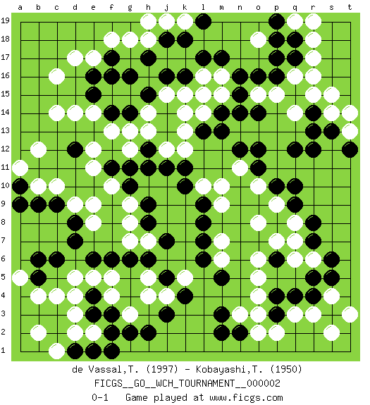 Last move : 0-1 2008 June 6 17:57:26 [Event "FICGS__GO__WCH_TOURNAMENT__000002"] [Site "FICGS"] [Date "2008.01.09"] [Round "1"] [Black "de Vassal,Thibault"] [White "Kobayashi,Tetsuya"] [Result "0-1"] [Rating 1 "1997"] [Rating 2 "1950"] 1.q4 d4 2.q17 c16 3.e16 e17 4.f17 d17 5.f16 c14 6.k16 r15 7.q15 q16 8.p16 r16 9.o16 q14 10.q12 r17 11.q18 p15 12.q9 o3 13.m3 r3 14.r4 q3 15.p4 o4 16.p6 o5 17.p3 p2 18.n2 o2 19.j3 g3 20.j5 d9 21.c6 c4 22.e6 h4 23.m5 o6 24.b9 b10 25.c9 c10 26.d8 e8 27.d7 e9 28.g6 f5 29.f6 f13 30.h2 h18 31.h17 f18 32.j18 g18 33.e1 e2 34.f2 d2 35.f3 f4 36.b5 b4 37.d1 c1 38.f1 b2 39.e3 d3 40.e4 e5 41.g2 d5 42.s3 s2 43.s5 t3 44.s13 q8 45.p8 p9 46.r8 q7 47.q10 p7 48.r7 o8 49.n14 k14 50.g14 g13 51.h9 h14 52.h15 s14 53.g10 r18 54.f11 e11 55.l8 m7 56.l7 m6 57.l6 o18 58.p17 q19 59.p19 r19 60.p18 o15 61.n16 l16 62.l15 k15 63.j16 j19 64.k18 k19 65.l19 h19 66.l17 l14 67.k11 m15 68.f14 e14 69.n15 h13 70.a10 a11 71.a9 b12 72.r13 g8 73.h8 t13 74.t12 t14 75.r12 j4 76.k4 h5 77.h6 q6 78.h12 r6 79.s6 m9 80.l9 m10 81.p10 o10 82.o11 n11 83.o12 s4 84.r5 l10 85.k10 j12 86.j11 g12 87.h11 m16 88.m17 k12 89.m14 l15 90.m13 j15 91.g16 n3 92.m2 a5 93.b6 g7 94.r14 s15 95.l13 k13 96.n12 f10 97.g11 g9 98.e15 d14 99.d12 e12 100.o14 h7 101.j7 k5 0-1 Here are the names of the openings (joseki) played in the four corners : Corner d16 : c16 e16 Komoku (Somok, Xiao~mu`) 3-4 Point. The komoku (3-4) point is the traditional corner enclosure move.. Ikken Takagakari (Hankan Nop'dakeolch'im, Yi Gaogua`jiao~, 1-Space High Approach). The 5-4 approach move has become more popular in modern times, as modern Go emphasizes speed and influence. Corner q16 : q17 r15 Komoku (Somok, Xiao~mu`) 3-4 Point. The komoku (3-4) point is the traditional corner enclosure move.. Ikken Kakari (Hankan Keolch'im, Yi Gua`jiao~, 1-Space Low Pincer). The small knight move is the basic approach move to the 3-4 point stone. It has been continually used for over four centuries. There are limitless variations, with new moves constantly being discovered. White 2 opens the door to a treaure store of joseki. Corner d4 : d4 j3 Hoshi (Hwajeom, Seongjeom, Xingwei`) 4-4 Point. The star or hoshi (4-4) point, emphasizing influence at the potential expense of territory. Player White won this Go (weiqi, baduk) game. Follow this game move after move (download)White is always trying to kill a bigger group than black is trying to save. (Anonymous) If you are going through hell, keep going. (Winston Churchill)