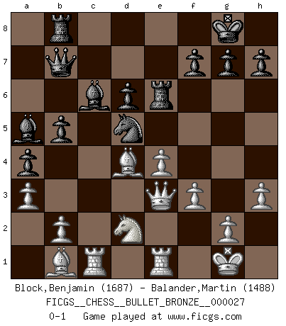 Last move : 0-1 2008 May 25 20:49:30 [Event "FICGS__CHESS__BULLET_BRONZE__000027"] [Site "FICGS"] [Date "2008.05.25"] [Round "1"] [White "Block,Benjamin"] [Black "Balander,Martin"] [Result "0-1"] [WhiteElo "1687"] [BlackElo "1488"] 1.e4 e5 2.Nf3 Nc6 3.Bb5 a6 4.Ba4 Nf6 5.O-O Be7 6.Re1 b5 7.Bb3 d6 8.c3 O-O 9.h3 Na5 10.Bc2 c5 11.d4 Qc7 12.Nbd2 cxd4 13.cxd4 Nc6 14.Nb3 a5 15.Be3 a4 16.Nbd2 Bd7 17.Rc1 Qb7 18.Qe2 Rfe8 19.Bd3 Rab8 20.a3 exd4 21.Nxd4 Ne5 22.Bb1 Bd8 23.N4f3 Nxf3+ 24.Qxf3 Bc6 25.Bd4 Ba5 26.Qe3 Re6 27.f3 Nd5 0-1 Ruy Lopez : Closed Kingside Castling by player White (move 5) Kingside Castling by player Black (move 8) Player Black won this chess game. Follow this game move after move (download)It began to feel as though you were playing against Chess itself. - On playing against Robert Fischer. (Walter Shipman) Um sich vor der Gefahr einer Erkältung zu schützen, sorge der wanderlustige König beizeiten für ein brauchbares Versteck. (Aaron Nimzowitsch) El ganador de una partida es aquel jugador que hace el penúltimo error. (Savielly Tartakover) Le système Elo représente seulement une moyenne. Il est simplement un indicateur de votre stabilité. (Anatoli Karpov) Pretend inferiority and encourage his arrogance. (Sun Tzu)