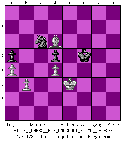 Last move : 1/2-1/2 2008 April 24 5:42:3 [Event "FICGS__CHESS__WCH_KNOCKOUT_FINAL__000002"] [Site "FICGS"] [Date "2008.01.10"] [Round "1"] [White "Ingersol,Harry"] [Black "Utesch,Wolfgang"] [Result "1/2-1/2"] [WhiteElo "2555"] [BlackElo "2523"] 1.c4 e5 2.g3 Nf6 3.Bg2 c6 4.d4 e4 5.Nc3 d5 6.cxd5 cxd5 7.Bg5 Bb4 8.Rc1 O-O 9.Nh3 Nbd7 10.O-O Bxc3 11.Rxc3 h6 12.Bf4 Nb6 13.f3 Bf5 14.g4 Bg6 15.g5 hxg5 16.Bxg5 Nbd7 17.Nf4 Qb6 18.Bh3 exf3 19.exf3 Rfe8 20.Qd2 Qd6 21.Nxg6 fxg6 22.Rfc1 Nh5 23.Rc7 Nf8 24.Rxb7 Ne6 25.Qb4 Qxb4 26.Bxe6+ Rxe6 27.Rxb4 Re2 28.Rf1 Rc8 29.Rf2 Rxf2 30.Kxf2 Rc2+ 31.Kg1 Kf7 32.a4 a5 33.Rb7+ Ke6 34.b3 Rc3 35.Kf2 Rc2+ 36.Ke3 Rxh2 37.Re7+ Kd6 38.Rxg7 Nxg7 39.Bf4+ Ke6 40.Bxh2 Nf5+ 41.Kd3 Ne7 42.Be5 Nc6 43.Bc7 g5 44.Bb6 Kf5 45.Ke3 g4 46.fxg4+ Kxg4 47.Bc5 Kf5 48.Bd6 1/2-1/2 English Opening Kingside Castling by player Black (move 8) Kingside Castling by player White (move 10) 10 pieces endgame at move 46 : White KBPPPP , Black KNPP WHITE : King + 1 Bishop 4 Pawns BLACK : King + 1 Knight 2 Pawns 9 pieces endgame at move 46 : White KBPPP , Black KNPP WHITE : King + 1 Bishop 3 Pawns BLACK : King + 1 Knight 2 Pawns This chess game ended in a draw. Follow this game move after move (download)I believe that Chess possesses a magic that is also a help in advanced age. A rheumatic knee is forgotten during a game of Chess and other events can seem quite unimportant in comparison with a catastrophe on the chessboard. (Vlastimil Hort) Frage: Was machen Sie mit den Preisen? Anwort: Ich habe Angst, dass meine Freundin davon neue Kleider kauft. (Loek van Wely) Bobby es el jugador de Ajedrez mas fino que este país jamás haya producido. Su memoria para las movidas, su brillantez en soñar combinaciones y su feróz determinación por la victoria son algo extraño. (John Collins) 'L'échange des dames est un coup dur pour les deux adversaires...' Un journaliste lors d'une partie du match Spassky-Fischer Coffee just isn't my cup of tea. (Unknown)
