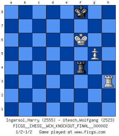 Last move : 1/2-1/2 2008 April 19 19:2:11 [Event "FICGS__CHESS__WCH_KNOCKOUT_FINAL__000002"] [Site "FICGS"] [Date "2008.01.10"] [Round "3"] [White "Ingersol,Harry"] [Black "Utesch,Wolfgang"] [Result "1/2-1/2"] [WhiteElo "2555"] [BlackElo "2523"] 1.d4 d5 2.c4 dxc4 3.e4 Nf6 4.e5 Nd5 5.Bxc4 Nb6 6.Bd3 Nc6 7.Ne2 Bg4 8.f3 Be6 9.Nbc3 Bc4 10.Bxc4 Nxc4 11.Qb3 Nb6 12.Be3 e6 13.d5 Nxd5 14.O-O-O Ncb4 15.Nxd5 Nxd5 16.Qxb7 Rb8 17.Qc6+ Qd7 18.Qxd7+ Kxd7 19.Nc3 c6 20.Bxa7 Ra8 21.Bd4 c5 22.Bf2 Kc6 23.Kc2 Nxc3 24.Kxc3 Rxa2 25.Ra1 Rxa1 26.Rxa1 Be7 27.Ra7 Re8 28.Kc4 f6 29.Ra6+ Kd7 30.exf6 gxf6 31.Ra7+ Kc6 32.g4 Bd6 33.Ra5 Kd7 34.Bxc5 Bxc5 35.Rxc5 e5 36.Kd5 Rb8 37.Ra5 Rxb2 38.Ra7+ Ke8 39.h4 Kf8 40.Rxh7 Rb4 41.g5 Rd4+ 42.Ke6 fxg5 43.hxg5 Rf4 44.Rh3 e4 45.fxe4 Rxe4+ 46.Kf6 Rf4+ 1/2-1/2 QGA : 3.e4 Queenside Castling by player White (move 14) 10 pieces endgame at move 37 : White KRPPP , Black KRPPP WHITE : King + 1 Rook 3 Pawns BLACK : King + 1 Rook 3 Pawns 9 pieces endgame at move 40 : White KRPPP , Black KRPP WHITE : King + 1 Rook 3 Pawns BLACK : King + 1 Rook 2 Pawns 8 pieces endgame at move 42 : White KRPP , Black KRPP WHITE : King + 1 Rook 2 Pawns BLACK : King + 1 Rook 2 Pawns 7 pieces endgame at move 43 : White KRPP , Black KRP WHITE : King + 1 Rook 2 Pawns BLACK : King + 1 Rook 1 Pawn 6 pieces endgame at move 45 : White KRPP , Black KR WHITE : King + 1 Rook 2 Pawns BLACK : King + 1 Rook 5 pieces endgame at move 45 : White KRP , Black KR WHITE : King + 1 Rook 1 Pawn BLACK : King + 1 Rook This chess game ended in a draw. Follow this game move after move (download)Chess is as much a mystery as women. (Purdy) Kein Großmeister ist normal. Sie unterscheiden sich nur im Ausmaß Ihrer Verrücktheit. (Viktor Kortschnoi) No volvere nunca a jugar contigo. Has insultado a mi amigo. - cuando un oponente se maldijo por una mala jugada (Miguel Najdorf) Les échecs sont un jeu par leur forme, un art par leur essence et une science par sa difficulté d'acquisition. Ils peuvent vous procurer autant de plaisir qu'un bon livre ou une belle musique, mais vous n'aurez une réelle joie que si vous arrivez à bien jouer. (Tigran Petrosian) Without enthusiasm, virtue functions not at all, and vice only poorly. (Mignon McLaughlin, The Neurotic's Notebook, 1960)