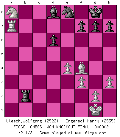 Last move : 1/2-1/2 2008 February 27 13:42:56 [Event "FICGS__CHESS__WCH_KNOCKOUT_FINAL__000002"] [Site "FICGS"] [Date "2008.01.10"] [Round "6"] [White "Utesch,Wolfgang"] [Black "Ingersol,Harry"] [Result "1/2-1/2"] [WhiteElo "2523"] [BlackElo "2555"] 1.e4 e5 2.Nf3 Nc6 3.Bb5 a6 4.Ba4 Nf6 5.O-O Be7 6.Re1 b5 7.Bb3 d6 8.a4 Bg4 9.c3 O-O 10.h3 Bh5 11.d4 Bxf3 12.Qxf3 exd4 13.Qd1 dxc3 14.Nxc3 Na5 15.axb5 axb5 16.Nxb5 Nxb3 17.Rxa8 Qxa8 18.Qxb3 Rb8 19.Nxc7 Rxb3 20.Nxa8 Bd8 21.Bf4 Rb8 22.Ra1 Rxb2 23.f3 Ne8 24.Ra7 1/2-1/2 Ruy Lopez : Closed Kingside Castling by player White (move 5) Kingside Castling by player Black (move 9) This chess game ended in a draw. Follow this game move after move (download)When you absolutely don't know what to do anymore, it is time to panic. (John van der Wiel) Versuche, dich von der Sklaverei der Eröffnungsvarianten zu befreien. Stattdessen soll man gewisse Typenpositionen erlernen, die man eingehend analysiert. (Aaron Nimzowitsch) El Ajedrez es como la guerra en un tablero. (Bobby Fischer) Mais l'homme est une créature légère et illogique : semblable au joueur d'échecs, il n'aime que le processus du but à atteindre, non le but lui-même. (Dostoïevsky) Big Chess is a place for big hallucinations. (Thibault de Vassal)