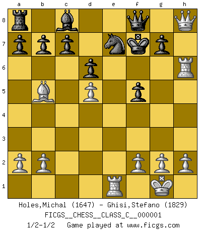 Last move : 1/2-1/2 2006 July 29 15:37:29 [Event "FICGS__CHESS__CLASS_C__000001"] [Site "FICGS"] [Date "2006.04.13"] [Round "1"] [White "Holes,Michal"] [Black "Ghisi,Stefano"] [Result "1/2-1/2"] [WhiteElo "1647"] [BlackElo "1829"] 1.e4 e5 2.Nf3 Nc6 3.Bc4 Bc5 4.c3 Nf6 5.d4 exd4 6.cxd4 Bb4+ 7.Nc3 Nxe4 8.O-O Bxc3 9.d5 Bf6 10.Re1 Ne7 11.Rxe4 d6 12.Bg5 Bxg5 13.Nxg5 O-O 14.Nxh7 Kxh7 15.Qh5+ Kg8 16.Rh4 f5 17.Qh7+ Kf7 18.Rh6 Rg8 19.Re1 Qf8 20.Bb5 Rh8 21.Qxh8 1/2-1/2 Giuoco Piano : Greco's attack Kingside Castling by player White (move 8) Kingside Castling by player Black (move 13) This chess game ended in a draw. Follow this game move after move (download)Some part of a mistake is always correct. (Savielly Tartakover) Die Fehler sind da, Sie warten nur darauf gemacht zu werden. (Savielly Grigorievitsch Tartakower) No puedes jugar al Ajedrez si eres de corazón noble. (Proverbio Francés) Les Echecs sont affaire de jugement sensible. Savoir quand frapper et quand esquiver. (Fischer) In theory there is no difference between theory and practice. In practice there is. (Yogi Berra)