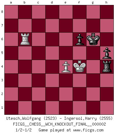 Last move : 1/2-1/2 2008 May 23 17:10:18 [Event "FICGS__CHESS__WCH_KNOCKOUT_FINAL__000002"] [Site "FICGS"] [Date "2008.01.10"] [Round "8"] [White "Utesch,Wolfgang"] [Black "Ingersol,Harry"] [Result "1/2-1/2"] [WhiteElo "2523"] [BlackElo "2555"] 1.Nf3 d5 2.d4 Nf6 3.c4 c6 4.Nc3 dxc4 5.a4 Bf5 6.e3 e6 7.Bxc4 Bb4 8.O-O Nbd7 9.Qe2 Bg4 10.h3 Bh5 11.Rd1 O-O 12.e4 Re8 13.Bf4 Qa5 14.g4 Bg6 15.Bd3 Qb6 16.a5 Bxa5 17.Nd2 Qd8 18.Nc4 Bb4 19.Nd6 Bxd6 20.Bxd6 Nb6 21.Bf4 Nfd7 22.Bc2 Qe7 23.Kg2 Qb4 24.Ra3 f6 25.h4 e5 26.Be3 Bf7 27.d5 Rec8 28.Rb3 Qd6 29.f3 h5 30.g5 fxg5 31.Bxg5 Nf6 32.Qf2 Kh8 33.dxc6 Qxc6 34.Rb5 Qc7 35.Be3 Nc4 36.Bxa7 Nxb2 37.Rb1 b6 38.Bxb6 Qxc3 39.R1xb2 Bc4 40.R5b4 Ra3 41.Bd1 Nxe4 42.Qc2 Nf6 43.Qxc3 Rxc3 44.Rd2 Kh7 45.Kf2 Kg6 46.Rc2 Bd5 47.Rxc3 Rxc3 48.Be3 e4 49.Bd4 Rc1 50.fxe4 Rxd1 51.Bxf6 gxf6 52.Ke2 Bb3 53.Rxb3 Rh1 54.Rb6 Rxh4 55.Kf3 Rh3+ 56.Kf4 Rh4+ 1/2-1/2 Reti Opening Kingside Castling by player White (move 8) Kingside Castling by player Black (move 11) 10 pieces endgame at move 51 : White KRBPP , Black KRBPP WHITE : King + 1 Rook 1 Bishop 2 Pawns BLACK : King + 1 Rook 1 Bishop 2 Pawns 9 pieces endgame at move 51 : White KRPP , Black KRBPP WHITE : King + 1 Rook 2 Pawns BLACK : King + 1 Rook 1 Bishop 2 Pawns 8 pieces endgame at move 53 : White KRPP , Black KRPP WHITE : King + 1 Rook 2 Pawns BLACK : King + 1 Rook 2 Pawns 7 pieces endgame at move 54 : White KRP , Black KRPP WHITE : King + 1 Rook 1 Pawn BLACK : King + 1 Rook 2 Pawns This chess game ended in a draw. Follow this game move after move (download)I'd rather have a Pawn than a finger. (Reuben Fine) Es war undenkbar für die Behörden, dass ein sowjetischer Großmeister auf diese Art und Weise [Fischer-Taimanov 6:0] verliert, ohne dass es eine politischer Erklärung dafür gäbe. (Mark Taimanov) El Ajedrez es un juego terrible. Si no dominas el centro, tu oponente tiene una posición mas libre. Si tu tienes el centro, entonces realmente tienes algo de que preocuparte. (Siegbert Tarrasch) La vie est comme un jeu d'échecs : nous esquissons un plan, mais celui-ci est tributaire de ce que daignent faire l'adversaire aux échecs et le destin dans la vie. (Arthur Schopenhauer) Only sick music makes money today. (Friedrich Nietzsche)