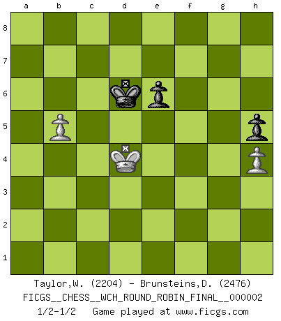 Last move : 1/2-1/2 2008 July 23 13:54:43 [Event "FICGS__CHESS__WCH_ROUND_ROBIN_FINAL__000002"] [Site "FICGS"] [Date "2008.01.11"] [Round "1"] [White "Taylor,William"] [Black "Brunsteins,Daniel"] [Result "1/2-1/2"] [WhiteElo "2204"] [BlackElo "2476"] 1.e4 c5 2.Nf3 d6 3.d4 cxd4 4.Nxd4 Nf6 5.Nc3 g6 6.Be3 Bg7 7.f3 O-O 8.Qd2 Nc6 9.Bc4 Bd7 10.O-O-O Ne5 11.Bb3 Rc8 12.Kb1 Re8 13.h4 h5 14.Bh6 Nc4 15.Bxc4 Rxc4 16.Bxg7 Kxg7 17.Qd3 Qc7 18.Qe3 Qc5 19.Rhe1 Rc8 20.Qd2 Qb4 21.Re3 a5 22.a3 Qc5 23.Nde2 Rc7 24.g3 Be8 25.Nf4 b5 26.Re2 Qe5 27.Qe1 b4 28.Ncd5 Rb7 29.Nxf6 Qxf6 30.Nd5 Qe6 31.axb4 axb4 32.b3 Rc5 33.Nxb4 Kh7 34.f4 Qc8 35.e5 dxe5 36.Rxe5 Rxe5 37.fxe5 Bd7 38.Kb2 Bf5 39.Rd4 Be6 40.Nd5 Qc5 41.Qc3 Qb5 42.Nf4 Qxe5 43.Rd2 Qxc3+ 44.Kxc3 Bf5 45.b4 e5 46.Nd3 Bxd3 47.cxd3 g5 48.d4 gxh4 49.gxh4 Kg6 50.dxe5 Kf5 51.Re2 Kg4 52.Re4+ Kf5 53.Re1 Ke6 54.Kc4 Rc7+ 55.Kb3 Kd5 56.b5 Rc4 57.e6 fxe6 58.Re5+ Kxe5 59.Kxc4 Kd6 60.Kd4 1/2-1/2 Sicilian : Dragon, Yugoslav attack, 7...O-O Kingside Castling by player Black (move 7) Queenside Castling by player White (move 10) 10 pieces endgame at move 49 : White KRPPP , Black KRPPP WHITE : King + 1 Rook 3 Pawns BLACK : King + 1 Rook 3 Pawns 9 pieces endgame at move 50 : White KRPPP , Black KRPP WHITE : King + 1 Rook 3 Pawns BLACK : King + 1 Rook 2 Pawns 8 pieces endgame at move 57 : White KRPP , Black KRPP WHITE : King + 1 Rook 2 Pawns BLACK : King + 1 Rook 2 Pawns 7 pieces endgame at move 58 : White KPP , Black KRPP WHITE : King + 2 Pawns BLACK : King + 1 Rook 2 Pawns 6 pieces endgame at move 59 : White KPP , Black KPP WHITE : King + 2 Pawns BLACK : King + 2 Pawns This chess game ended in a draw. Follow this game move after move (download)I prefer to lose a really good game than to win a bad one. (David Levy) Moralische Siege zählen nicht. (Savielly Grigorievitsch Tartakower) Tu cuerpo tiene que estar en óptima condición. Tu Ajedrez se deteriora como lo hace tu cuerpo. No puedes separar la mente y el cuerpo. (Bobby Fischer) Il a essayé de se convaincre qu'il pourrait empêcher toutes les erreurs et ne jamais perdre. L'horreur ! Gary Kasparov au sujet de Robert Fischer. Good decisions come from experience, and experience comes from bad decisions. (Anonymous)