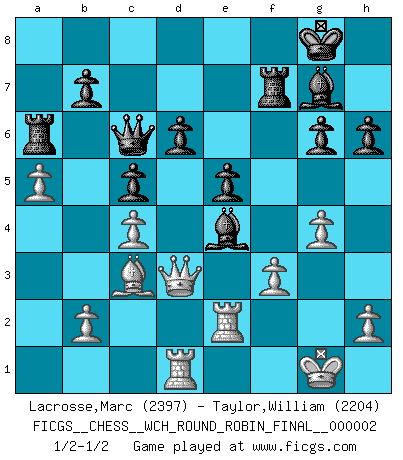 Last move : 1/2-1/2 2008 March 30 10:25:8 [Event "FICGS__CHESS__WCH_ROUND_ROBIN_FINAL__000002"] [Site "FICGS"] [Date "2008.01.11"] [Round "1"] [White "Lacrosse,Marc"] [Black "Taylor,William"] [Result "1/2-1/2"] [WhiteElo "2397"] [BlackElo "2204"] 1.e4 c5 2.Nf3 Nc6 3.Nc3 e6 4.Bb5 Qb6 5.Bxc6 Qxc6 6.d4 Nf6 7.d5 Qa6 8.a4 d6 9.Nb5 Qa5+ 10.Bd2 Qb6 11.O-O Nxe4 12.Re1 a6 13.Rxe4 axb5 14.a5 Qc7 15.dxe6 fxe6 16.Ng5 e5 17.Qf3 g6 18.Re2 h6 19.Ne4 Bg7 20.Qd3 Ra6 21.Qxb5+ Bd7 22.Qd3 Be6 23.c4 O-O 24.Bc3 Qc6 25.Rd1 Bf5 26.f3 Rf7 27.g4 Bxe4 1/2-1/2 Sicilian defense Kingside Castling by player White (move 11) Kingside Castling by player Black (move 23) This chess game ended in a draw. Follow this game move after move (download)Chess is the gymnasium of the mind. (Blaise Pascal) Kasparov ist eine Art Monster mit hundert Augen, denen auch nicht das Geringste entgeht. (Tony Miles) Cuando la partida de Ajedrez termina, el Peón y el Rey regresan a la misma caja. (Irish saying) L'ordinateur a tué l'originalité. Il n'y a plus guère d'aventures sur l'échiquier. (Jacob Murray) Strategy without tactics is the slowest route to victory. Tactics without strategy is the noise before defeat. (Sun Tzu)