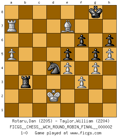 Last move : 1-0 2008 May 18 13:9:23 [Event "FICGS__CHESS__WCH_ROUND_ROBIN_FINAL__000002"] [Site "FICGS"] [Date "2008.01.11"] [Round "1"] [White "Rotaru,Dan"] [Black "Taylor,William"] [Result "1-0"] [WhiteElo "2205"] [BlackElo "2204"] 1.d4 Nf6 2.c4 e6 3.Nc3 Bb4 4.e3 O-O 5.Bd3 d5 6.Nf3 c5 7.O-O Nc6 8.a3 Bxc3 9.bxc3 dxc4 10.Bxc4 Qc7 11.Bb5 a6 12.Bxc6 Qxc6 13.a4 a5 14.Re1 b6 15.Ne5 Qd6 16.e4 Bb7 17.f3 cxd4 18.Qxd4 Qc7 19.Bf4 Nh5 20.Be3 Rfd8 21.Qxb6 Qxe5 22.Qxb7 Qxc3 23.Rac1 Qa3 24.Qb5 Nf6 25.Bb6 Rdb8 26.Red1 h6 27.Rb1 Rb7 28.Bc5 Rxb5 29.Bxa3 Rxb1 30.Rxb1 Nd7 31.Rb5 f6 32.Bb2 Rb8 33.Kf1 e5 34.Ba3 Ra8 35.h4 Nf8 36.Bc5 Ne6 37.Bb6 Kf7 38.g3 Ke8 39.Be3 g5 40.h5 Ng7 41.g4 Ne6 42.Rb6 Kf7 43.Rb7+ Kg8 44.Ra7 Rb8 45.Rxa5 Rb1+ 46.Ke2 Rb2+ 47.Kd3 Rb3+ 48.Kd2 Nf4 49.Bc5 Ne6 50.Ra8+ Kf7 51.Ra7+ Kg8 52.Be7 Nd4 53.a5 1-0 Comment by player 1 : Dan Rotaru : Thanks for the game! Nimzo-Indian : 4.e3 O-O, 5.Bd3 d5 Kingside Castling by player Black (move 4) Kingside Castling by player White (move 7) Player White won this chess game. Follow this game move after move (download)All I want to do, ever, is just play Chess. (Bobby Fischer) Capablanka war das größte Genie der Schachgeschichte! Aber denken sie nicht er habe nichts vom Schach verstanden. Er wusste nur soviel wie er wissen musste um seine Ziele zu erreichen. (Mikhail Moiseyevich Botvinik) Desconfianza es la característica mas necesaria de un jugador de Ajedrez. (Siegbert Tarrasch) Aucun coup ne doit être joué sans but. (Pedro Damiano) A proverb is a short sentence based on long experience. (Miguel de Cervantes)