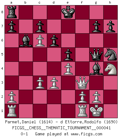 Last move : 0-1 2008 February 1 16:49:43 [Event "FICGS__CHESS__THEMATIC_TOURNAMENT__000041"] [Site "FICGS"] [Date "2008.01.12"] [Round "1"] [White "Parmet,Daniel"] [Black "d Ettorre,Rodolfo"] [Result "0-1"] [WhiteElo "1614"] [BlackElo "1690"] 1.e4 e5 2.Nf3 Nc6 3.Bc4 Nf6 4.Ng5 Bc5 5.Bxf7+ Ke7 6.Bd5 Rf8 7.O-O d6 8.Bxc6 bxc6 9.d3 Qe8 10.Nf3 Qg6 11.c3 Bg4 12.Nbd2 Nh5 13.b4 Bb6 14.h3 Bxh3 15.Nh4 Qg5 16.Ndf3 Qg4 17.Bg5+ Ke8 18.Qa4 Kd7 19.b5 Rxf3 20.bxc6+ Ke8 21.Qd1 Qxg5 22.Qxf3 Bg4 0-1 Two knights defense : Wilkes Barre (Traxler) variation Kingside Castling by player White (move 7) Player Black won this chess game. Follow this game move after move (download)Chess holds its master in its own bonds, shackling the mind and brain so that the inner freedom of the very strongest must suffer. (Albert Einstein) Kleine Schachspieler machen Mist, und große Schachspieler machen Mist, aber große machen weniger Mist. (Fritz Sämisch) Cuando veas una buena jugada, trata de encontrar otra mejor. (Emanuel Lasker) Le joueur d'Echecs qui veut atteindre le top est obligé de développer son propre credo créatif. Alexeï Stepanovicth Souétine. Il est facile d'écrire des livres ! Ce qui est difficile, c'est de jouer ! (Alexeï Stepanovicth Souétine) When you've done things right people won't know you've done anything at all. (Futurama)