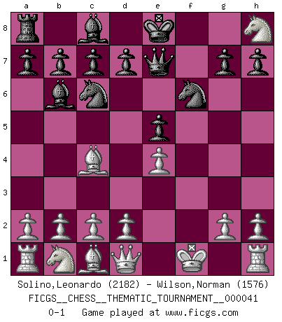 Last move : 0-1 2008 February 24 2:22:48 [Event "FICGS__CHESS__THEMATIC_TOURNAMENT__000041"] [Site "FICGS"] [Date "2008.01.12"] [Round "1"] [White "Solino,Leonardo"] [Black "Wilson,Norman"] [Result "0-1"] [WhiteElo "2182"] [BlackElo "1576"] 1.e4 e5 2.Nf3 Nc6 3.Bc4 Nf6 4.Ng5 Bc5 5.Nxf7 Bxf2+ 6.Kf1 Qe7 7.Nxh8 Bb6 0-1 This chess game has been lost on time (started : 2008.01.12 12:9:19) Two knights defense : Wilkes Barre (Traxler) variation Player Black won this chess game. Follow this game move after move (download)Nonsense was the last thing Fischer was interested in, as far as Chess was concerned. (Elie Agur) Wie bekannt hörte Morphy 1859 auf, Schach zu spielen. Seine Enttäuschung galt nicht so sehr dem Schach, wie den Schachspielern. (Robert James Fischer) Diferente gente reacciona diferentemente en aceptar la derrota. (Bobby Fischer) Vouloir jouer aux échecs contre soi-même est aussi paradoxal que vouloir marcher sur son ombre. (Stefan Zweig) Who needs drugs and alcohol if he can play Big Chess at FICGS ? (Heinz-Georg Lehnhoff)
