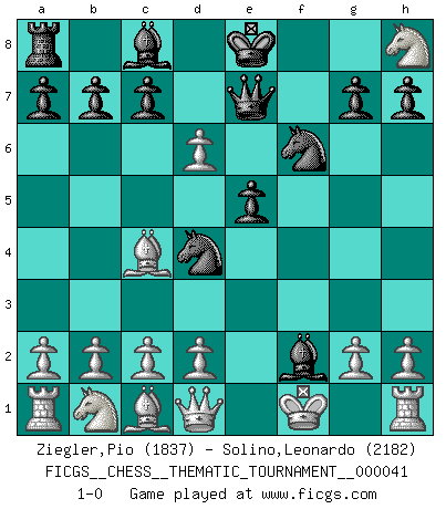 Last move : 1-0 2008 February 25 14:38:16 [Event "FICGS__CHESS__THEMATIC_TOURNAMENT__000041"] [Site "FICGS"] [Date "2008.01.12"] [Round "1"] [White "Ziegler,Pio"] [Black "Solino,Leonardo"] [Result "1-0"] [WhiteElo "1837"] [BlackElo "2182"] 1.e4 e5 2.Nf3 Nc6 3.Bc4 Nf6 4.Ng5 Bc5 5.Nxf7 Bxf2+ 6.Kf1 Qe7 7.Nxh8 d5 8.exd5 Nd4 9.d6 1-0 This chess game has been lost on time (started : 2008.01.12 12:9:19) Two knights defense : Wilkes Barre (Traxler) variation Player White won this chess game. Follow this game move after move (download)You sit at the board and suddenly your heart leaps. Your hand trembles to pick up the piece and move it. But what Chess teaches you is that you must sit there calmly and think about whether it's really a good idea and whether there are other better ideas. (Stanley Kubrick) Schach ist Krieg, im Schach geht es um testosterongesteuerte Urschreie. (Garry Kasparov) El Ajedrez es sobre todo, ¡una pelea!. (Emanuel Lasker) Ce n'est pas pour s'amuser qu'il joue aux échecs : il célèbre un culte. (Vladimir Nabokov) The smarter you play, the luckier you'll be. (Mark Pilarski)