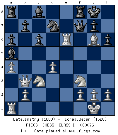 Last move : 1-0 2008 March 6 8:1:52 [Event "FICGS__CHESS__CLASS_D__000076"] [Site "FICGS"] [Date "2008.01.14"] [Round "1"] [White "Dats,Dmitry"] [Black "Florea,Oscar"] [Result "1-0"] [WhiteElo "1689"] [BlackElo "1626"] 1.d4 d5 2.c4 c6 3.Nc3 Nf6 4.Nf3 dxc4 5.a4 e6 6.Bg5 h6 7.Bxf6 Qxf6 8.e4 Bb4 9.Bxc4 Nd7 10.O-O O-O 11.Na2 Ba5 12.e5 Qg6 13.Nc3 a6 14.Re1 Bb4 15.Bd3 f5 16.exf6 Qxf6 17.Qb3 Ba5 18.Rxe6 Qf7 19.Bg6 1-0 QGD Slav defense Kingside Castling by player White (move 10) Kingside Castling by player Black (move 10) Player White won this chess game. Follow this game move after move (download)Weak points or holes in the opponent's position must be occupied by pieces not Pawns. (Siegbert Tarrasch) Schach wird sich dank seiner hohen kulturellen Tradition immer durchsetzen. In näherer Zukunft womöglich sogar als Gegenreaktion auf die maßlose Reizüberflutung im Freizeit- und Spielbereich. (Garry Kasparov) El Ajedrez es tortura mental. (Garry Kasparov) On peut tirer plus d'utilité d'une partie perdue que de 100 parties gagnées. (Capablanca) Don't anthropomorphize computers - they hate it. (Anonymous)