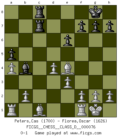 Last move : 0-1 2008 June 9 23:56:9 [Event "FICGS__CHESS__CLASS_D__000076"] [Site "FICGS"] [Date "2008.01.14"] [Round "1"] [White "Peters,Cas"] [Black "Florea,Oscar"] [Result "0-1"] [WhiteElo "1700"] [BlackElo "1626"] 1.d4 d5 2.c4 c6 3.Nf3 Nf6 4.Nc3 dxc4 5.a4 Bf5 6.e3 e6 7.Bxc4 Bb4 8.Qb3 a5 9.O-O O-O 10.Na2 Bd6 11.Qxb7 Nbd7 12.Qxc6 Be7 13.Be2 Be4 14.Qb5 Qc7 15.Nc3 Rfb8 16.Qc4 Rc8 17.Qxc7 Rxc7 18.Nxe4 Nxe4 19.Bd3 Ndf6 20.Nd2 Rac8 21.Nxe4 Nxe4 22.Bxe4 Bb4 0-1 This chess game has been lost on time (started : 2008.01.14 12:54:52) QGD Slav : Dutch variation Kingside Castling by player White (move 9) Kingside Castling by player Black (move 9) Player Black won this chess game. Follow this game move after move (download)Chess is a cold bath for the mind. (Sir John Simon) Die unerbitterlichsten Regeln im Schach sind die Ausnahmen. (Savielly Grigorievitsch Tartakower) Cuando veas una buena jugada, trata de encontrar otra mejor. (Emanuel Lasker) Dans le domaine de la peinture, de la gravure et de la sculpture, dès la première décennie de notre siècle, les artistes abandonnent la représentation de la partie d'échecs pour se concentrer sur les pièces, sur les échiquiers et sur toutes les variations auxquelles les unes et les autres peuvent donner lieu. On passe en quelque sorte d'un thème social à un thème musical (au sens de la musica médiévale, c'est-à-dire d'une notion qui inclue le rythme, l'harmonie, la construction et la déconstruction, etc.). Graphiquement et picturalement, l'échiquier apparaît comme une structure ouverte, dynamique, d'une richesse infinie, autorisant toutes les combinatoires et débouchant sur des mouvements et des rythmes de nature exponentielle. (Michel Pastoureau) When you stop learning you start dying. (M. Scott Adams)