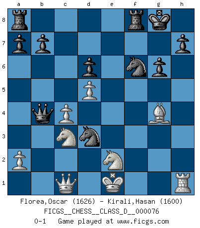 Last move : 0-1 2008 March 8 13:43:20 [Event "FICGS__CHESS__CLASS_D__000076"] [Site "FICGS"] [Date "2008.01.14"] [Round "1"] [White "Florea,Oscar"] [Black "Kirali,Hasan"] [Result "0-1"] [WhiteElo "1626"] [BlackElo "1600"] 1.d4 Nf6 2.c4 g6 3.Nc3 Bg7 4.e4 d6 5.f3 O-O 6.Be3 e5 7.d5 c6 8.Qd2 cxd5 9.exd5 Na6 10.Bh6 Bxh6 11.Qxh6 Nc5 12.h4 Qa5 13.g4 Nb3 14.Rd1 Nc5 15.h5 Na4 16.Qc1 e4 17.Be2 exf3 18.Bxf3 Bxg4 19.hxg6 fxg6 20.Rd3 Qb4 21.Nge2 Nxb2 22.Bxg4 Nxd3+ 0-1 King's Indian : Saemisch, Orthodox, 7.d5 c6 Kingside Castling by player Black (move 5) Player Black won this chess game. Follow this game move after move (download)No Chess Grandmaster is normal; they only differ in the extent of their madness. (Viktor Korchnoi) Ja, jede Frau in Holland liebt mich bestimmt, und alle Männer hassen mich. (Loek van Wely) Debió haber existido una vez en que los hombres eran semidióses, de otra manera no hubiesen podido inventar el Ajedrez. (Gustav Schenk) Les échecs sont plus proches de l'art de l'assassinat que de l'art de la guerre. (Arturo Perez-Reverte) Whoever said the pen is mightier than the sword obviously never encountered automatic weapons. (US General Douglas MacArthur)