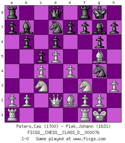 Last move : 1-0 2008 April 22 20:23:55 [Event "FICGS__CHESS__CLASS_D__000076"] [Site "FICGS"] [Date "2008.01.14"] [Round "1"] [White "Peters,Cas"] [Black "Piek,Johann"] [Result "1-0"] [WhiteElo "1700"] [BlackElo "1631"] 1.c4 c5 2.Nc3 Nf6 3.Nf3 b6 4.e4 d6 5.d4 Bb7 6.d5 g6 7.Bg5 Bg7 8.Be2 O-O 9.Qd2 Nbd7 10.O-O Ng4 11.h3 1-0 This chess game has been lost on time (started : 2008.01.14 12:54:52) English : Symmetrical variation Kingside Castling by player Black (move 8) Kingside Castling by player White (move 10) Player White won this chess game. Follow this game move after move (download)You are for me the Queen on d8 and I am the Pawn on d7 !! (Eduard Gufeld) Schach ist die gewalttätigste aller Sportarten. (Garry Kasparov) La vida es como el Ajedrez, con lucha, competición y eventos buenos y malos. (Benjamin Franklin) La victoire dans une partie d'Echecs appartient la plupart du temps à celui qui voit un peu plus loin que l'adversaire. (Lasker) Train yourself to let go of everything you fear to lose. (Master Yoda in Star Wars ep.3)