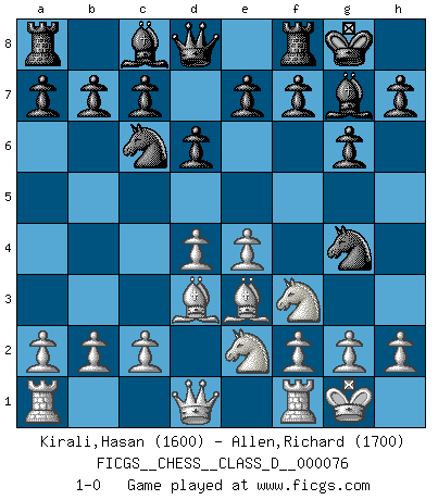 Last move : 1-0 2008 February 26 14:38:32 [Event "FICGS__CHESS__CLASS_D__000076"] [Site "FICGS"] [Date "2008.01.14"] [Round "1"] [White "Kirali,Hasan"] [Black "Allen,Richard"] [Result "1-0"] [WhiteElo "1600"] [BlackElo "1700"] 1.e4 d6 2.d4 Nf6 3.Nc3 g6 4.Nf3 Bg7 5.Bd3 Nc6 6.Be3 Ng4 7.O-O O-O 8.Ne2 1-0 This chess game has been lost on time (started : 2008.01.14 12:54:52) Pirc : Classical (Two knights) system Kingside Castling by player White (move 7) Kingside Castling by player Black (move 7) Player White won this chess game. Follow this game move after move (download)The older I grow, the more I value Pawns. (Keres) Ich spiele 70 Eröffnungssysteme. (Viktor Kortschnoi) Una partida de Ajedrez se divide en 3 etapas: la primera cuando piensas que tienes la ventaja, la segunda cuando crees que tienes la ventaja y la tercera... ¡cuando te das cuenta que vas a perder!. (Savielly Tartakower) Vous n'êtes pas toujours obligé de jouer le meilleur coup. Un coup doit être actif, entreprenant, correct et beau ! (David Bronstein) Strategy without tactics is the slowest route to victory. Tactics without strategy is the noise before defeat. (Sun Tzu)