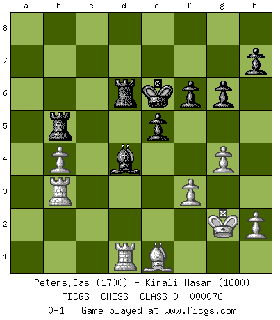 Last move : 0-1 2008 June 14 0:10:15 [Event "FICGS__CHESS__CLASS_D__000076"] [Site "FICGS"] [Date "2008.01.14"] [Round "1"] [White "Peters,Cas"] [Black "Kirali,Hasan"] [Result "0-1"] [WhiteElo "1700"] [BlackElo "1600"] 1.e4 c5 2.Nf3 Nc6 3.d4 cxd4 4.Nxd4 e6 5.Nc3 a6 6.Be2 Bc5 7.Nb3 Ba7 8.Bf4 e5 9.Bd2 Nge7 10.O-O O-O 11.Nd5 d6 12.Bg5 Be6 13.c4 f6 14.Bh4 Nd4 15.Nxd4 Bxd4 16.Kh1 b5 17.Qb3 bxc4 18.Bxc4 Bf7 19.Nxe7+ Qxe7 20.Rab1 Bxc4 21.Qxc4+ Qf7 22.Qxf7+ Rxf7 23.f3 d5 24.exd5 Rd7 25.Bg3 Rxd5 26.b4 Rb8 27.a3 a5 28.Rfd1 axb4 29.axb4 R8b5 30.Be1 Kf7 31.g4 Rd6 32.Rb3 Ke6 33.Kg2 g6 0-1 Sicilian defense Kingside Castling by player White (move 10) Kingside Castling by player Black (move 10) Player Black won this chess game. Follow this game move after move (download)I played Chess with him and would have beaten him sometimes only he always took back his last move, and ran the game out differently. (Mark Twain) Wie bekannt hörte Morphy 1859 auf, Schach zu spielen. Seine Enttäuschung galt nicht so sehr dem Schach, wie den Schachspielern. (Robert James Fischer) ¿Porque tengo que perder ante este idiota?. (Aron Nimzovich) On peut tirer plus d'utilité d'une partie perdue que de 100 parties gagnées. (Capablanca) Mandala - that's it! 16x16 squares as multiple of the four and the eight because of the Four Noble Truths and the Noble Eightfold Path. (Heinz-Georg Lehnhoff about Big Chess)