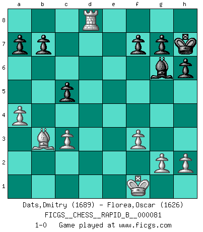Last move : 1-0 2008 March 14 9:16:11 [Event "FICGS__CHESS__RAPID_B__000081"] [Site "FICGS"] [Date "2008.01.14"] [Round "1"] [White "Dats,Dmitry"] [Black "Florea,Oscar"] [Result "1-0"] [WhiteElo "1689"] [BlackElo "1626"] 1.d4 d5 2.c4 c6 3.Nc3 Nf6 4.Nf3 dxc4 5.a4 Bf5 6.Ne5 Nbd7 7.Nxc4 e6 8.f3 Bb4 9.e4 Bg6 10.Be3 O-O 11.Be2 c5 12.O-O h6 13.d5 Bxc3 14.bxc3 exd5 15.exd5 Re8 16.Qd2 Nxd5 17.Qxd5 Qc7 18.Qd2 Rad8 19.Bf4 Qc8 20.Nd6 Nf6 21.Nxc8 Rxd2 22.Bxd2 Rxc8 23.Bc4 Rd8 24.Be3 Nd5 25.Rad1 Nxe3 26.Rxd8+ Kh7 27.Bb3 Nxf1 28.Kxf1 1-0 QGD Slav defense Kingside Castling by player Black (move 10) Kingside Castling by player White (move 12) Player White won this chess game. Follow this game move after move (download)I like to say that Bobby Fischer was the greatest player ever. But what made Fischer a genius was his ability to blend an American freshness and pragmatism with Russian ideas about strategy. (Bruce Pandolfini) Kann Schach nicht schließlich das Nationalspiel der Deutschen werden? Und welche weiteren Ausblicke bieten sich dann dar! Welche Hebung des allgemeinen Kultur-Niveaus, ja der Moral, wenn das Schachbrett den Kartentisch verdrängen würde! Wahrlich, ein Ziel, des Schweißes der Edlen wert! (Siegbert Tarrasch) Antes de los Finales, los dioses han colocado el Juego Medio. (Siegbert Tarrasch) Il s'avisa de me proposer d'apprendre les échecs qu'il jouait un peu... me voilà forcené des échecs. J'achète un échiquier, je m'enferme dans ma chambre, j'y passe des jours et des nuits à vouloir apprendre par cœur toutes les parties. (Jean-Jacques Rousseau, Confessions) Empty your mind, be formless, shapeless — like water. (Bruce Lee)