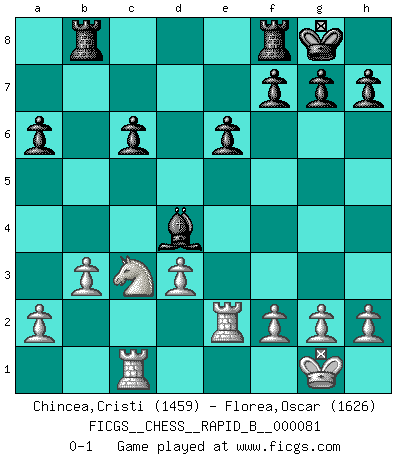 Last move : 0-1 2008 April 2 6:50:57 [Event "FICGS__CHESS__RAPID_B__000081"] [Site "FICGS"] [Date "2008.01.14"] [Round "1"] [White "Chincea,Cristi"] [Black "Florea,Oscar"] [Result "0-1"] [WhiteElo "1459"] [BlackElo "1626"] 1.e4 c6 2.d4 d5 3.e5 Bf5 4.Nf3 e6 5.Bd3 Bxd3 6.Qxd3 c5 7.O-O Nc6 8.Be3 a6 9.dxc5 Nge7 10.Nc3 Nf5 11.Rfe1 d4 12.Nxd4 Nxe3 13.Nxc6 Qxd3 14.cxd3 bxc6 15.Rxe3 Bxc5 16.Re2 O-O 17.Rd2 Rab8 18.b3 Bd4 19.Rc1 Bxe5 20.Re2 Bd4 0-1 This chess game has been lost on time (started : 2008.01.14 13:2:50) Caro-Kann : Advance variation Kingside Castling by player White (move 7) Kingside Castling by player Black (move 16) Player Black won this chess game. Follow this game move after move (download)At this time Fischer is simply a level above all the best Chessplayers in the world. (John Jacobs) Kasparov ist eine Art Monster mit hundert Augen, denen auch nicht das Geringste entgeht. (Tony Miles) Vive, pierde y aprende al observar a tu oponente como gana. (Amber Steenbock) Psychologiquement, tu dois avoir confiance en toi même, mais cette confiance doit être basée sur des faits. (Robert Fischer) Kids, you tried your best and you failed miserably. The lesson is, never try. (Simpsons)
