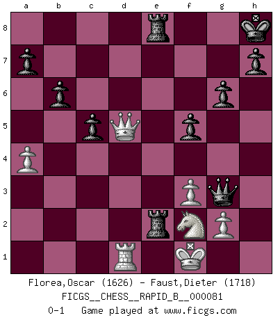 Last move : 0-1 2008 March 16 11:18:52 [Event "FICGS__CHESS__RAPID_B__000081"] [Site "FICGS"] [Date "2008.01.14"] [Round "1"] [White "Florea,Oscar"] [Black "Faust,Dieter"] [Result "0-1"] [WhiteElo "1626"] [BlackElo "1718"] 1.d4 Nf6 2.c4 g6 3.Nc3 Bg7 4.e4 d6 5.f3 O-O 6.Be3 e5 7.Qd2 exd4 8.Bxd4 Nc6 9.Be3 Be6 10.Bd3 Ne5 11.Nge2 Bxc4 12.Bxc4 Nxc4 13.Qc1 Nd7 14.Bf4 Nc5 15.Qc2 Nxb2 16.O-O Nc4 17.Rad1 Ne6 18.Bg3 Ne3 19.Qb3 Nc5 20.Qb1 Nxf1 21.Kxf1 Re8 22.Nd5 c6 23.Ne3 d5 24.e5 Bxe5 25.Ng4 Bxg3 26.Nxg3 f5 27.Nf2 Qh4 28.Qc2 Qxh2 29.Qxc5 Qxg3 30.Qb4 b6 31.Qb3 Re6 32.a4 Rae8 33.Qc3 Re2 34.Qd4 c5 35.Qxd5+ Kh8 0-1 King's Indian : Saemisch, Orthodox variation Kingside Castling by player Black (move 5) Kingside Castling by player White (move 16) Player Black won this chess game. Follow this game move after move (download)In Fischer's hands, a slight theoretical advantage is as good a being a Queen ahead. (Isaac Kashdan) Ich kenne keine einzige Person, die behaupten würde, Garri Kasparow sei ein guter Mensch (Nigel Short) Un Peón pasado aumenta su poder a medida de que el número de piezas en el tablero disminuye. (Capablanca) Dans le domaine de la peinture, de la gravure et de la sculpture, dès la première décennie de notre siècle, les artistes abandonnent la représentation de la partie d'échecs pour se concentrer sur les pièces, sur les échiquiers et sur toutes les variations auxquelles les unes et les autres peuvent donner lieu. On passe en quelque sorte d'un thème social à un thème musical (au sens de la musica médiévale, c'est-à-dire d'une notion qui inclue le rythme, l'harmonie, la construction et la déconstruction, etc.). Graphiquement et picturalement, l'échiquier apparaît comme une structure ouverte, dynamique, d'une richesse infinie, autorisant toutes les combinatoires et débouchant sur des mouvements et des rythmes de nature exponentielle. (Michel Pastoureau) Quotation,n.: The act of repeating erroneously the words of another. The words erroneously repeated. (Ambrose Bierce, The Devil's Dictionary)