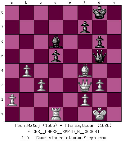 Last move : 1-0 2008 June 1 22:33:3 [Event "FICGS__CHESS__RAPID_B__000081"] [Site "FICGS"] [Date "2008.01.14"] [Round "1"] [White "Pech,Matej"] [Black "Florea,Oscar"] [Result "1-0"] [WhiteElo "1686"] [BlackElo "1626"] 1.e4 c6 2.d4 d5 3.Nc3 dxe4 4.Nxe4 Nd7 5.Bc4 Ngf6 6.Ng5 e6 7.Qe2 Nb6 8.Bd3 h6 9.N5f3 Be7 10.c3 O-O 11.Ne5 c5 12.Ngf3 Nbd7 13.Be3 Qc7 14.O-O b6 15.Bf4 Bb7 16.Ng6 Qd8 17.Nxf8 Nxf8 18.dxc5 Bxc5 19.Rad1 Qe7 20.Rfe1 Nh5 21.Be5 Rd8 22.Ba6 Rxd1 23.Rxd1 Bxf3 24.Qxf3 Qg5 25.Bb8 Ng6 26.Bxa7 Ne5 27.Qa8+ Kh7 28.Qe4+ Ng6 29.b4 Nf6 30.Qc2 Be7 31.Bxb6 h5 32.Bd4 Nd5 33.Bb7 Kg8 34.Qe4 Ngf4 35.Bxd5 exd5 36.Qf3 h4 37.Be3 Bd6 38.g3 hxg3 39.hxg3 g6 40.Bxf4 1-0 Caro-Kann : Steinitz variation Kingside Castling by player Black (move 10) Kingside Castling by player White (move 14) Player White won this chess game. Follow this game move after move (download)Who is your opponent tonight, tonight I am playing against the Black pieces. (Akiba Rubinstein) Die westlichen Werte sind eine Sprache, welche die Putin-Administration nicht versteht. (Garry Kasparov) a manera como él juega al Ajedrez, demuestra la completa naturaleza de un hombre. (Stanley Ellin) Je fais ceci parce que dans cinquante coups j'obtiendrai cela; je m'appelle Mikhail Moisevitch Botvinnik. (Botvinnik) If you lose the game you should win the analysis! (Proverb)