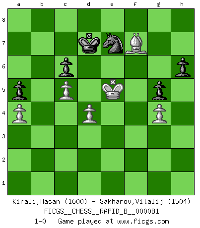 Last move : 1-0 2008 February 5 21:51:47 [Event "FICGS__CHESS__RAPID_B__000081"] [Site "FICGS"] [Date "2008.01.14"] [Round "1"] [White "Kirali,Hasan"] [Black "Sakharov,Vitalij"] [Result "1-0"] [WhiteElo "1600"] [BlackElo "1504"] 1.e4 c6 2.d4 d5 3.Nc3 dxe4 4.f3 exf3 5.Nxf3 Bf5 6.Bc4 e6 7.O-O Nf6 8.Bg5 Be7 9.Qe2 Nbd7 10.Rad1 Nb6 11.Bb3 Nbd5 12.Nxd5 Nxd5 13.Bxe7 Nxe7 14.Rde1 O-O 15.c3 Qd6 16.Nh4 Rae8 17.Nxf5 exf5 18.Rxf5 Nxf5 19.Qxe8 Rxe8 20.Rxe8+ Qf8 21.Rxf8+ Kxf8 22.Kf2 f6 23.Bc2 Ne7 24.c4 h6 25.Ke3 Kf7 26.b4 Ke6 27.Bb3 g5 28.g3 f5 29.Kd3 Ng6 30.c5 Kd7 31.a4 f4 32.Ke4 fxg3 33.hxg3 Ne7 34.g4 b6 35.Bf7 bxc5 36.bxc5 a5 37.Ke5 1-0 Caro-Kann : Rasa-Studier gambit Kingside Castling by player White (move 7) Kingside Castling by player Black (move 14) Player White won this chess game. Follow this game move after move (download)The stomach is an essential part of the Chess master. (Bent Larsen) Deine Wertungszahl - vorausgesetzt einige Jahre schachliche Anstrengung - entspricht etwa dem zehnfachen Deines IQ plus 1000. (Jonathan Levitt) Por tratar de evitar la pérdida de una pieza, muchas personas han perdido una partida de Ajedrez. (Savielly Tartakover) C'est une question de caractère, Beaucoup de gens perdent leur motivation très vite. D'autres, ils sont rares, peuvent la conserver très longtemps. J'aime les échecs, encore aujourd'hui je suis heureux d'analyser des parties. J'aime toujours gagner, je déteste encore perdre. Bien jouer est important pour mon intégrité intellectuelle et morale. Et puis les échecs vivent en ce moment une période historique grâce à Internet. Ils se développent dans les systèmes éducatifs à travers le monde. Ils sortent de leur ghetto, et c'est mon rôle de mener à bien cette révolution. (Gary Kasparov) Lamb in skin of tiger, still fears the wolf. (Chinese proverb)