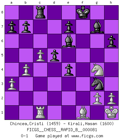 Last move : 0-1 2008 March 30 18:37:57 [Event "FICGS__CHESS__RAPID_B__000081"] [Site "FICGS"] [Date "2008.01.14"] [Round "1"] [White "Chincea,Cristi"] [Black "Kirali,Hasan"] [Result "0-1"] [WhiteElo "1459"] [BlackElo "1600"] 1.d4 Nf6 2.c4 g6 3.Nf3 Bg7 4.Bf4 d6 5.e3 c6 6.Be2 O-O 7.O-O Nh5 8.Bg5 h6 9.Bh4 g5 10.Bg3 Qb6 11.Qc2 Nxg3 12.fxg3 g4 13.Nfd2 c5 14.Nc3 cxd4 15.exd4 Qxd4+ 16.Kh1 Nc6 17.a3 Qe3 18.Nde4 f5 19.Nd1 Qxe4 20.Qxe4 fxe4 21.Rxf8+ Kxf8 22.Rc1 Be6 23.b4 Nd4 24.Bf1 Rc8 25.Ne3 d5 26.c5 Nf5 27.Nxg4 Nxg3+ 0-1 This chess game has been lost on time (started : 2008.01.14 13:2:50) King's Indian, 3.Nf3 Kingside Castling by player Black (move 6) Kingside Castling by player White (move 7) Player Black won this chess game. Follow this game move after move (download)What is the difference between chess and football? Everybody understands football, but nobody plays it. Everybody plays chess, but nobody understands it. Everything is relative. (Vladimir Kramnik) Mutter, ich bin eben Ex-Weltmeister geworden. --beim nach Hause Kommen nach dem Verlust des WM-Titels an Mihail Botvinnik -- (Mikhail Nekhemyevich Tal) En el Ajedrez, cuando menos, el valiente hereda la tierra. (Edmar Mednis) Roi des jeux et jeu des rois, les échecs portent en eux un sentiment d'infini. Ils donnent à celui qui s'est efforcé d'en approfondir les arcanes l'impression de n'être pas à la mesure de l'homme; en fait, ils constituent un résumé de l'univers, un microcosme, et figurent cette grande échelle qui, dans les plans de la lumière descend jusqu'à la matière, qui des abîmes insondables remonte jusqu'en l'infini de Dieu. (Pyrame) There are two kinds of tragedy in this world, one is not getting what you want and the other is getting. (Lord of war)
