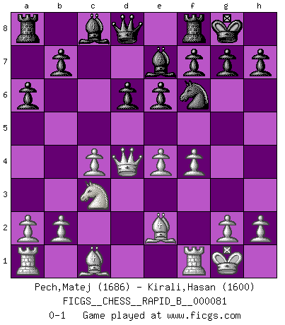 Last move : 0-1 2008 March 20 21:51:19 [Event "FICGS__CHESS__RAPID_B__000081"] [Site "FICGS"] [Date "2008.01.14"] [Round "1"] [White "Pech,Matej"] [Black "Kirali,Hasan"] [Result "0-1"] [WhiteElo "1686"] [BlackElo "1600"] 1.e4 c5 2.Nf3 Nc6 3.d4 cxd4 4.Nxd4 a6 5.c4 d6 6.Nc3 e6 7.Be2 Nxd4 8.Qxd4 Nf6 9.O-O Be7 10.f4 O-O 0-1 Sicilian defense Kingside Castling by player White (move 9) Kingside Castling by player Black (move 10) Player Black won this chess game. Follow this game move after move (download)It's just you and your opponent at the board and you're trying to prove something. (Bobby Fischer) Ich war schon mal beim Dopingtest. Da musste ich Urin abgeben, während Dritte zusahen. (Elisabeth Pähtz) Un Peón pasado es un criminal, quién debe ser mantenido bajo candado y llave. Leves medidas, tales como vigilancia policiaca, no son suficientes. (Aaron Nimzovich) Le moment que je préfère le plus dans une rencontre, c'est celui où je sens que la personnalité de l'adversaire se brise. (Robert Fischer) Be who you are, and say what you feel because those who mind don't matter, and those who matter don't mind. (Dr Seuss)
