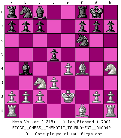 Last move : 1-0 2008 February 26 2:38:28 [Event "FICGS__CHESS__THEMATIC_TOURNAMENT__000042"] [Site "FICGS"] [Date "2008.01.15"] [Round "1"] [White "Hess,Volker"] [Black "Allen,Richard"] [Result "1-0"] [WhiteElo "1319"] [BlackElo "1700"] 1.e4 e5 2.f4 exf4 3.Nc3 Qh4+ 4.Ke2 Nf6 5.Qe1 Qh5+ 6.Nf3 Bb4 7.Qh4 Qxh4 8.Nxh4 O-O 9.d3 d5 10.Bxf4 1-0 This chess game has been lost on time (started : 2008.01.15 1:51:25) KGA : Keres (Mason-Steinitz) gambit Kingside Castling by player Black (move 8) Player White won this chess game. Follow this game move after move (download)I feel as if I were a piece in a game of Chess, when my opponent says of it: That piece cannot be moved. (Soren Kierkegaard) Das Schach hält seine Meister in eigenen Banden, Fesseln; auf vielerlei Weise formt es ihren Geist, so dass die innere Freiheit selbst des Stärksten beeinflusst wird. (Albert Einstein) Muchos se han convertido en Maestros de Ajedrez, nadie se ha convertido en el Maestro del Ajedrez. (Siegbert Tarrasch) Il n'y a pas de prix trop élevé au scalp de l'ennemi. (Koblentz) To send light into the darkness of men's hearts - such is the duty of the artist. (Schumann)