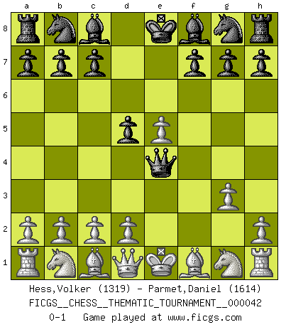 Last move : 0-1 2008 January 18 7:17:57 [Event "FICGS__CHESS__THEMATIC_TOURNAMENT__000042"] [Site "FICGS"] [Date "2008.01.15"] [Round "1"] [White "Hess,Volker"] [Black "Parmet,Daniel"] [Result "0-1"] [WhiteElo "1319"] [BlackElo "1614"] 1.e4 e5 2.f4 d5 3.fxe5 Qh4+ 4.g3 Qxe4+ 0-1 KGD : Falkbeer counter-gambit Player Black won this chess game. Follow this game move after move (download)You know you're going to lose. Even when I was ahead I knew I was going to lose. - On playing against Fischer. (Andrew Soltis) Privat ist Kortschnoi kein schlechter Mensch, sehr sympathisch. Aber während des Spiels ist er grausam. Er will dich töten. (Miguel Najdorf) Si tu oponente no puede hacer nada activo, entonces no apures la posición; En vez de eso, dejalo estar sentado ahí, sufriendo y rogandote por un empate. (Jeremy Silman) Comme les marins qui ont mille raisons différentes d'aller en mer, les joueurs d'échecs en ont tout autant avant de s'installer devant une table et jouer... (Vincent Bertignac, philosophe) Wisdom doesn't necessarily come with age. Sometimes age just shows up all by itself. (Tom Wilson)