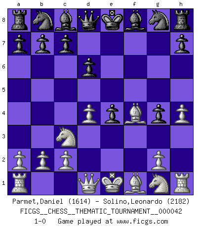 Last move : 1-0 2008 March 1 14:55:15 [Event "FICGS__CHESS__THEMATIC_TOURNAMENT__000042"] [Site "FICGS"] [Date "2008.01.15"] [Round "1"] [White "Parmet,Daniel"] [Black "Solino,Leonardo"] [Result "1-0"] [WhiteElo "1614"] [BlackElo "2182"] 1.e4 e5 2.f4 exf4 3.Nf3 d6 4.d4 g5 5.h4 g4 6.Ng1 f5 7.Nc3 fxe4 8.Bxf4 1-0 This chess game has been lost on time (started : 2008.01.15 1:51:25) KGA : Fischer defense Player White won this chess game. Follow this game move after move (download)Chess is like war on a board. (Bobby Fischer) Der Verteidiger gebe der Gewalt nach, aber nur der Gewalt. Er schaffe sich nicht freiwillig, etwa aus Blindheit oder aus Schrecken, irgendwelche Schwächen. Er lasse sich nicht bluffen. (Emanuel Lasker) El Ajedrez es el gimnasio de la mente. (Blaise Pascal) Horreur, mais aussi harmonie suprême : qu'y avait-il en effet au monde en dehors des échecs ? Le brouillard, l'inconnu, le non-être... (Vladimir Nabokov) A good player is always lucky. (Capablanca)