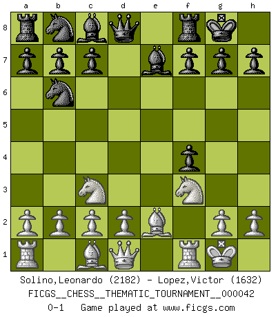 Last move : 0-1 2008 March 22 4:49:19 [Event "FICGS__CHESS__THEMATIC_TOURNAMENT__000042"] [Site "FICGS"] [Date "2008.01.15"] [Round "1"] [White "Solino,Leonardo"] [Black "Lopez,Victor"] [Result "0-1"] [WhiteElo "2182"] [BlackElo "1632"] 1.e4 e5 2.f4 d5 3.exd5 exf4 4.Nf3 Nf6 5.Bc4 Nxd5 6.O-O Be7 7.Nc3 Nb6 8.Be2 O-O 0-1 This chess game has been lost on time (started : 2008.01.15 1:51:25) KGD : Falkbeer counter-gambit Kingside Castling by player White (move 6) Kingside Castling by player Black (move 8) Player Black won this chess game. Follow this game move after move (download)If a ruler does not understand Chess, how can he rule over a kingdom ? (King Khusros II) Pläne sind die Träume des Verständigen. (Ernst Freiherr von Feuchtersleben) Todavía soy una víctima del Ajedrez. Tiene toda la belleza del arte y mucho mas. No puede ser comercializado. El Ajedrez es mas puro que el arte en su posición social. (Marcel Duchamp) Les échecs c'est le défi de l'alpiniste, toujours plus haut, prêt à tout pour monter à l'assaut du Roi ennemi. Les échecs, c'est de la musique en mouvement, un ballet majestueux pour les yeux. C'est de la poésie composée par les fantômes du passé qui au même titre que Rimbaud ou Verlaine méritent notre admiration. Les échecs, c'est de la peinture ou le moindre mouvement modifie le tableau pour en faire un Picasso ou un Van Gogh. Les échecs, c'est tout et rien, c'est la vie et la mort. Jjulie33 sur le forum de France-Echecs. Treat your password like your toothbrush. Don't let anybody else use it, and get a new one every six months. (Clifford Stoll)