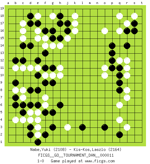 Last move : 1-0 2008 June 6 4:14:44 [Event "FICGS__GO__TOURNAMENT_DAN__000011"] [Site "FICGS"] [Date "2008.01.15"] [Round "1"] [Black "Nabe,Yuki"] [White "Kis-Kos,Laszlo"] [Result "1-0"] [Rating 1 "2108"] [Rating 2 "2164"] 1.e17 q4 2.c5 q16 3.o3 q6 4.q2 r3 5.l3 c16 6.c14 e16 7.f16 e15 8.d17 c15 9.d14 c17 10.h17 d11 11.c12 c11 12.f13 f15 13.g16 g14 14.e12 c7 15.d3 k17 16.r14 r12 17.p14 o16 18.q11 q12 19.p12 r11 20.q10 r10 21.q9 r8 22.p13 g18 23.h18 e18 24.d18 j15 25.h15 h14 26.j16 k16 27.j17 k18 28.g15 f14 29.f11 o11 30.p11 o10 31.q8 r7 32.s16 r17 33.s17 s18 34.r16 q18 35.e6 e3 36.d2 j3 37.g3 e4 38.g5 d5 39.d6 f6 40.f5 e5 41.c6 e2 42.f2 c4 43.e1 d4 44.h6 f7 45.b7 b4 46.d8 c8 47.e8 b8 48.b6 f10 49.e10 e11 50.f9 g10 51.g11 h11 52.g9 h10 53.b12 b11 54.b9 1-0 Here are the names of the openings (joseki) played in the four corners : Corner q4 : q4 o3 Hoshi (Hwajeom, Seongjeom, Xingwei`) 4-4 Point. The star or hoshi (4-4) point, emphasizing influence at the potential expense of territory. Ikken Kakari (Hankan Keolch'im, Yi Gua`jiao~, 1-Space Low Approach). Black 2 is the standard approach move to the 4-4. Corner d16 : e17 c16 Mokuhazushi (Waemok, Wai`mu`) 5-3 Point. The mokuhazushi (5-3) point was popular in the Edo period in Japan (1600 - 1867). It emphasizes influence; territorially, it is inferior to the 3-4 point. Komoku Kakari. White 2 is the standard approach because of its solidity and stability. Corner d4 : c5 c7 Mokuhazushi (Waemok, Wai`mu`) 5-3 Point. The mokuhazushi (5-3) point was popular in the Edo period in Japan (1600 - 1867). It emphasizes influence; territorially, it is inferior to the 3-4 point. Corner q16 : q16 r14 Hoshi (Hwajeom, Seongjeom, Xingwei`) 4-4 Point. The star or hoshi (4-4) point, emphasizing influence at the potential expense of territory. Ikken Kakari (Hankan Keolch'im, Yi Gua`jiao~, 1-Space Low Approach). Black 2 is the standard approach move to the 4-4. Player Black won this Go (weiqi, baduk) game. Follow this game move after move (download)Go is essentially a form of harmony. Go in the 21st century will have to be go of the 'harmony of the six points - the four quarters, the above and the below.' As in life we will need to view the whole rather than the part. Japanese go has focused too heavily on the local (joseki) rather than the whole for 300 years. The reason the Chinese and Koreans are overtaking the Japanese is that they are closer to achieve this whole-board view. (Go Seigen, 9p, 1994) The arrogant army will lose certainly the battle. (Chinese proverb)