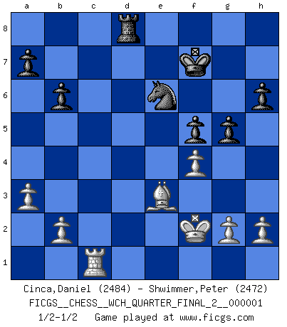Last move : 1/2-1/2 2006 September 9 15:26:56 [Event "FICGS__CHESS__WCH_QUARTER_FINAL_2__000001"] [Site "FICGS"] [Date "2006.07.01"] [Round "3"] [White "Cinca,Daniel"] [Black "Shwimmer,Peter"] [Result "1/2-1/2"] [WhiteElo "2484"] [BlackElo "2472"] 1.d4 Nf6 2.c4 e6 3.Nc3 Bb4 4.Qc2 O-O 5.a3 Bxc3+ 6.Qxc3 b6 7.Bg5 Bb7 8.f3 h6 9.Bh4 d5 10.e3 Nbd7 11.cxd5 Nxd5 12.Bxd8 Nxc3 13.Bh4 Nd5 14.Bf2 c5 15.e4 Ne7 16.Bb5 Bc6 17.Bxc6 Nxc6 18.Ne2 Rac8 19.O-O Rfd8 20.Rfd1 cxd4 21.Nxd4 Nxd4 22.Bxd4 f5 23.exf5 exf5 24.Rac1 Rxc1 25.Rxc1 Nf8 26.Be3 Ne6 27.f4 Kf7 28.Kf2 g5 1/2-1/2 Nimzo-Indian : Classical variation Kingside Castling by player Black (move 4) Kingside Castling by player White (move 19) This chess game ended in a draw. Follow this game move after move (download)Chess is the gymnasium of the mind. (Blaise Pascal) Ich habe Kasparov in Rente geschickt. (Veselin Topalov) Todo se encuentra en un estado de flujo y esto incluye al mundo del Ajedrez. (Mikhail Botvinnik) Il (Jacob Murray) ne joue pas pour le bon coup, mais pour le meilleur. (Eloi Relange) What doesn't kill us makes us stronger. (Friedrich Nietzsche)