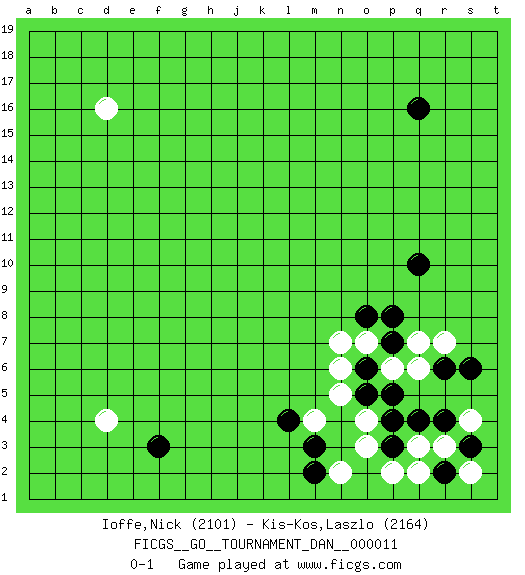 Last move : 0-1 2008 March 31 8:55:36 [Event "FICGS__GO__TOURNAMENT_DAN__000011"] [Site "FICGS"] [Date "2008.01.15"] [Round "1"] [Black "Ioffe,Nick"] [White "Kis-Kos,Laszlo"] [Result "0-1"] [Rating 1 "2101"] [Rating 2 "2164"] 1.q16 d4 2.q4 d16 3.q10 o3 4.m3 r3 5.r4 q3 6.p4 o4 7.p3 p2 8.o5 n2 9.m2 n5 10.o6 m4 11.l4 n6 12.o8 o7 13.p7 n7 14.f3 p6 15.p5 q6 16.s3 s2 17.r2 q2 18.r6 q7 19.p8 r7 20.s6 s4 0-1 Here are the names of the openings (joseki) played in the four corners : Corner q4 : q4 o3 Hoshi (Hwajeom, Seongjeom, Xingwei`) 4-4 Point. The star or hoshi (4-4) point, emphasizing influence at the potential expense of territory. Ikken Kakari (Hankan Keolch'im, Yi Gua`jiao~, 1-Space Low Approach). White 2 is the standard approach move to the 4-4. Corner d4 : d4 f3 Hoshi (Hwajeom, Seongjeom, Xingwei`) 4-4 Point. The star or hoshi (4-4) point, emphasizing influence at the potential expense of territory. Ikken Kakari (Hankan Keolch'im, Yi Gua`jiao~, 1-Space Low Approach). Black 2 is the standard approach move to the 4-4. Player White won this Go (weiqi, baduk) game. Follow this game move after move (download)The second line is the line of defeat, the third line is the line of territory, and the fourth line is the line of influence. (Anonymous) He who is a good ruler must first have been ruled. (Aristotle)