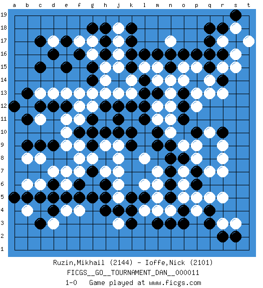 Last move : 1-0 2008 April 11 11:36:52 [Event "FICGS__GO__TOURNAMENT_DAN__000011"] [Site "FICGS"] [Date "2008.01.15"] [Round "1"] [Black "Ruzin,Mikhail"] [White "Ioffe,Nick"] [Result "1-0"] [Rating 1 "2144"] [Rating 2 "2101"] 1.q16 d17 2.q3 q5 3.d4 f4 4.c15 c13 5.e15 g17 6.f16 f17 7.c17 c6 8.d6 d7 9.c5 e6 10.d5 e7 11.d16 r3 12.e17 n17 13.k17 n14 14.k15 j16 15.k16 h14 16.h16 r17 17.q17 s15 18.r16 s16 19.s17 q14 20.r14 r15 21.q15 r13 22.p14 q13 23.n15 m15 24.m16 o15 25.n16 o14 26.o16 p15 27.p16 n4 28.o4 o5 29.r2 s3 30.q4 r5 31.n3 p4 32.o3 m4 33.m3 l4 34.k3 j5 35.h4 k13 36.r10 r8 37.p10 n10 38.o12 p12 39.o11 k14 40.m13 m14 41.q8 r9 42.q9 r7 43.o13 p13 44.p6 p5 45.n8 l8 46.m9 m11 47.m10 n11 48.l11 m12 49.l12 n13 50.l13 n12 51.l14 o9 52.k10 l15 53.g11 f13 54.e12 e13 55.d12 d13 56.c12 b12 57.b11 h11 58.h10 g12 59.j11 f11 60.h12 f12 61.f10 e10 62.b13 f9 63.g10 c11 64.a12 e11 65.o8 p8 66.p7 p9 67.n6 q7 68.n5 j7 69.g5 g6 70.f5 j9 71.j10 m7 72.n7 o6 73.k12 h13 74.f6 f7 75.h6 h7 76.h5 j6 77.k4 l6 78.g9 f8 79.g7 g8 80.h8 h9 81.k9 j8 82.l5 m5 83.k5 m6 84.c9 c8 85.d9 e9 86.b9 g16 87.g15 h15 88.h17 j17 89.h18 j18 90.g18 j15 91.l16 o7 92.n9 q10 93.g14 j13 94.j12 g13 95.k18 b6 96.b5 b8 97.s2 s18 98.r18 t17 99.s19 r17 100.q18 b4 101.a5 j3 102.j4 e4 103.e5 d3 104.c3 1-0 Here are the names of the openings (joseki) played in the four corners : Corner q4 : q3 q5 Komoku (Somok, Xiao~mu`) 3-4 Point. The komoku (3-4) point is the traditional corner enclosure move.. Ikken Takagakari (Hankan Nop'dakeolch'im, Yi Gaogua`jiao~, 1-Space High Approach). The 5-4 approach move has become more popular in modern times, as modern Go emphasizes speed and influence. Corner d4 : d4 f4 Hoshi (Hwajeom, Seongjeom, Xingwei`) 4-4 Point. The star or hoshi (4-4) point, emphasizing influence at the potential expense of territory. Ikken Takagakari (Hankan Nop'dakeolch'im, Yi Gaojia, 1-Space High Approach). Black typically responds at 6-4 or 3-10. Black 4-10 is played when Black finds play on the right side advantageous. Black 4-8 or 3-8 may be played when Black has support at top. Corner d16 : d17 c15 Komoku (Somok, Xiao~mu`) 3-4 Point. The komoku (3-4) point is the traditional corner enclosure move.. Ikken Kakari (Hankan Keolch'im, Yi Gua`jiao~, 1-Space Low Pincer). The small knight move is the basic approach move to the 3-4 point stone. It has been continually used for over four centuries. There are limitless variations, with new moves constantly being discovered. Black 2 opens the door to a treaure store of joseki. Corner q16 : q16 n17 Hoshi (Hwajeom, Seongjeom, Xingwei`) 4-4 Point. The star or hoshi (4-4) point, emphasizing influence at the potential expense of territory. Nikken Kakari (Dukan Keolch'im, E`r Gua`jiao~, 2-Space Low Approach). Black typically answers by 7-3 or 3-5 (which is not joseki). Player Black won this Go (weiqi, baduk) game. Follow this game move after move (download)When your opponent is thick, you must also become thick. (Otake Hideo, 9p) They say in chess you've got to kill the queen, and then you mate it... Oh I, do you ? (Red Hot Chili Peppers, Fortune faded)