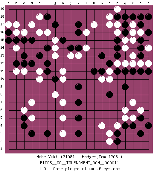 Last move : 1-0 2008 May 22 15:42:57 [Event "FICGS__GO__TOURNAMENT_DAN__000011"] [Site "FICGS"] [Date "2008.01.15"] [Round "1"] [Black "Nabe,Yuki"] [White "Hodges,Tom"] [Result "1-0"] [Rating 1 "2108"] [Rating 2 "2081"] 1.q16 d17 2.r4 p4 3.d3 d5 4.c5 c6 5.c4 d7 6.f3 c11 7.k17 r5 8.s5 q5 9.r6 s4 10.s3 s6 11.t4 r7 12.r11 o17 13.p18 p17 14.q17 o18 15.q18 m17 16.g17 l16 17.k16 l14 18.c15 f16 19.c13 c16 20.d15 e16 21.e13 g13 22.h15 g15 23.j14 j13 24.k14 k13 25.f18 e18 26.p3 o3 27.p2 n4 28.p11 b14 29.b12 b11 30.c12 e11 31.f12 h11 32.f11 e10 33.g10 g8 34.b15 b16 35.a16 a17 36.a15 b17 37.f14 g14 38.d12 h3 39.k3 o2 40.q4 q6 41.k5 h5 42.k7 h7 43.k9 r13 44.p13 q14 45.p14 q15 46.p15 r16 47.s17 r17 48.r18 s16 49.s18 s12 50.s14 r15 51.s11 t12 52.t11 t14 53.s13 r12 54.t16 t17 55.t18 q12 56.q11 p12 57.o12 p16 58.n13 o11 59.n11 o10 60.q9 n10 61.m11 p19 62.s15 h10 63.o8 1-0 Here are the names of the openings (joseki) played in the four corners : Corner q4 : r4 p4 Komoku (Somok, Xiao~mu`) 3-4 Point. The komoku (3-4) point is the traditional corner enclosure move.. Ikken Takagakari (Hankan Nop'dakeolch'im, Yi Gaogua`jiao~, 1-Space High Approach). The 5-4 approach move has become more popular in modern times, as modern Go emphasizes speed and influence. Corner d4 : d3 d5 Komoku (Somok, Xiao~mu`) 3-4 Point. The komoku (3-4) point is the traditional corner enclosure move.. Ikken Takagakari (Hankan Nop'dakeolch'im, Yi Gaogua`jiao~, 1-Space High Approach). The 5-4 approach move has become more popular in modern times, as modern Go emphasizes speed and influence. Player Black won this Go (weiqi, baduk) game. Follow this game move after move (download)Don't reduce your own liberties. (Bill Taylor) Bobby never cared about money, though. His only desire was to prove that his choices were correct: He wanted chess to be important because he was a chess player, and he wanted to be important. Bobby knew money was important, but he didn't have a clue why, outside of clothes and status. The only way he could accomplish what he wanted was to fight for a lot of money. Once he got it, he gave it away. He did not know how to spend it. And once he'd become champion, after, essentially, sacrificing his life for it, he didn't know how to spend his time. (Bob Wade)